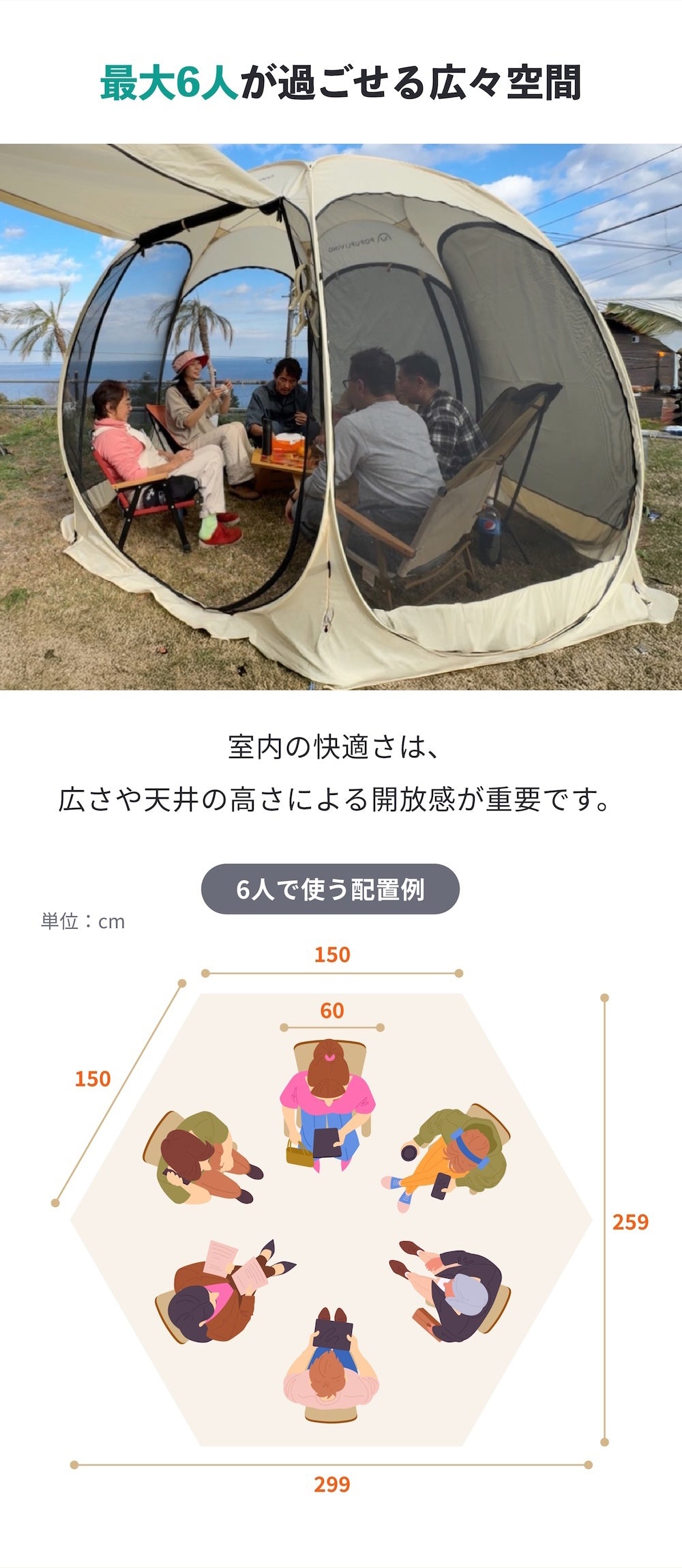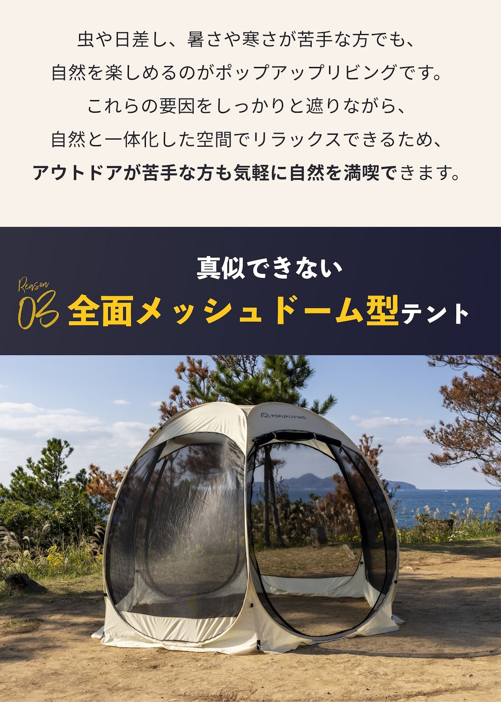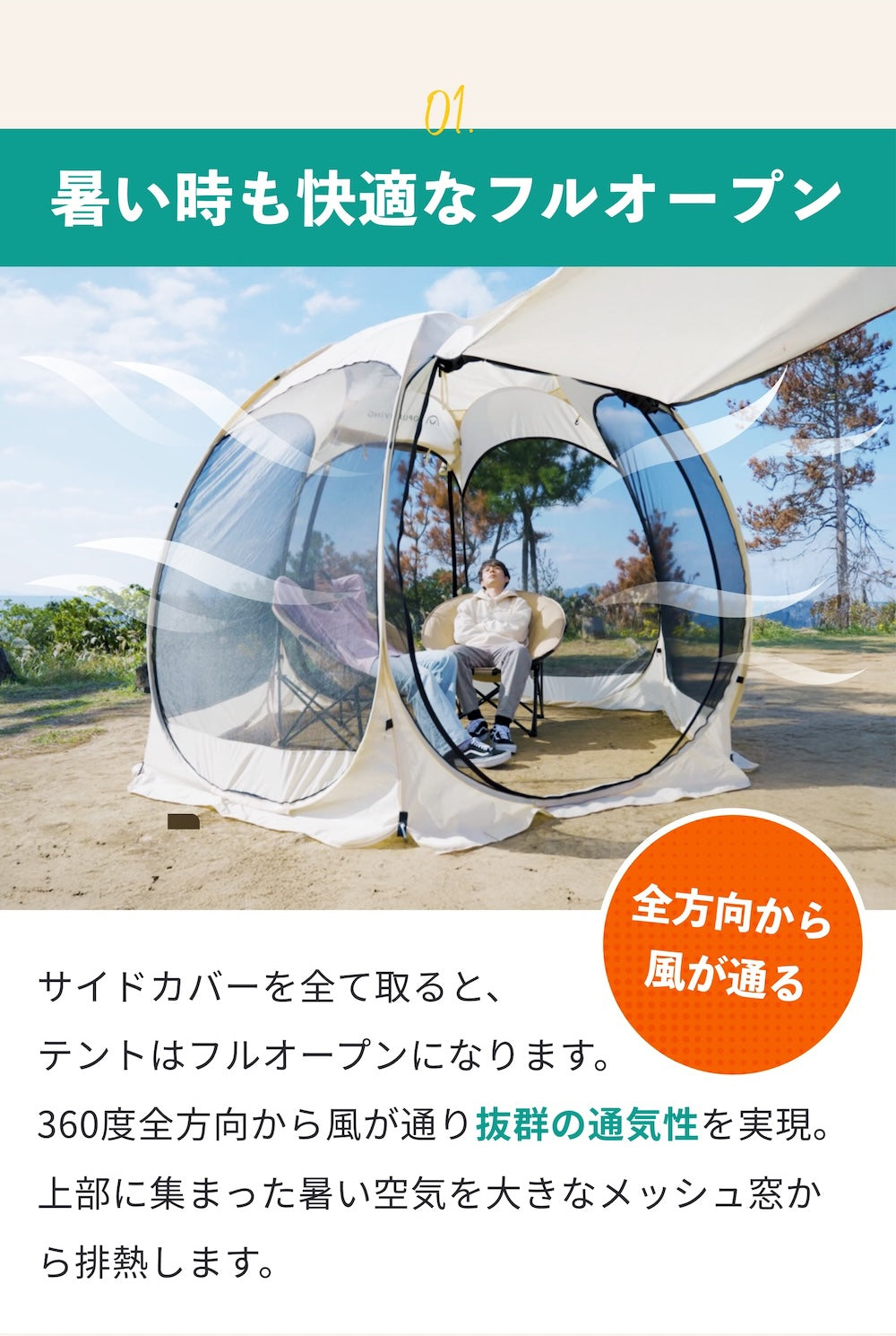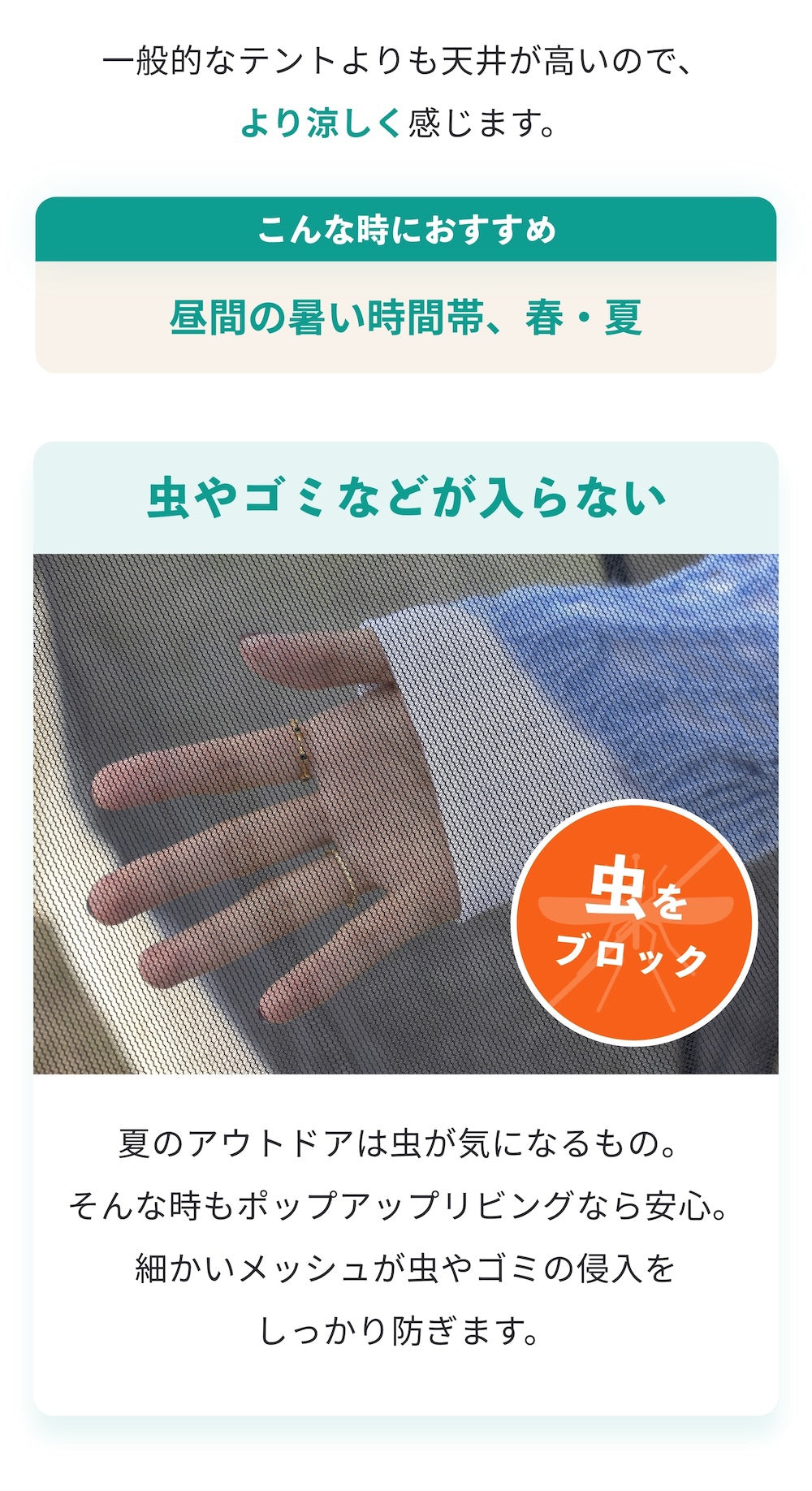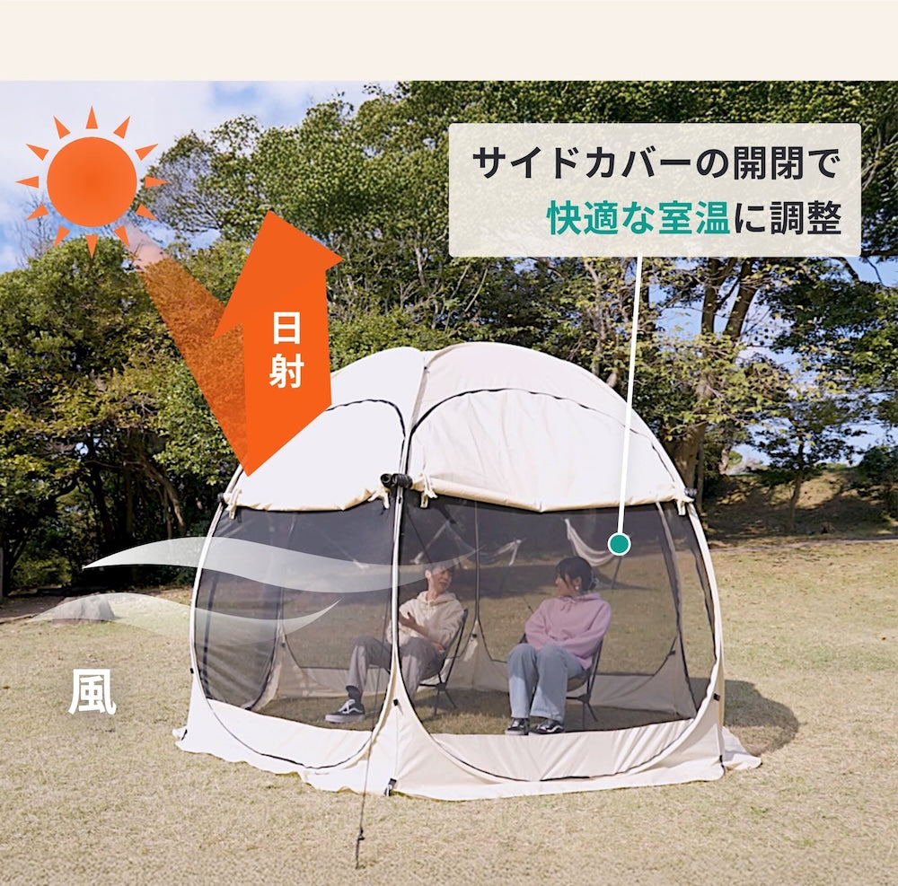 多くのテントは風が通らず、太陽で内部がヒーターのように熱くなり真夏には使えませんが、ポップアップリビングは天井が高く、テント内の上空空間に集まった暑い空気をサイドの大きなメッシュ窓から排熱することができます。