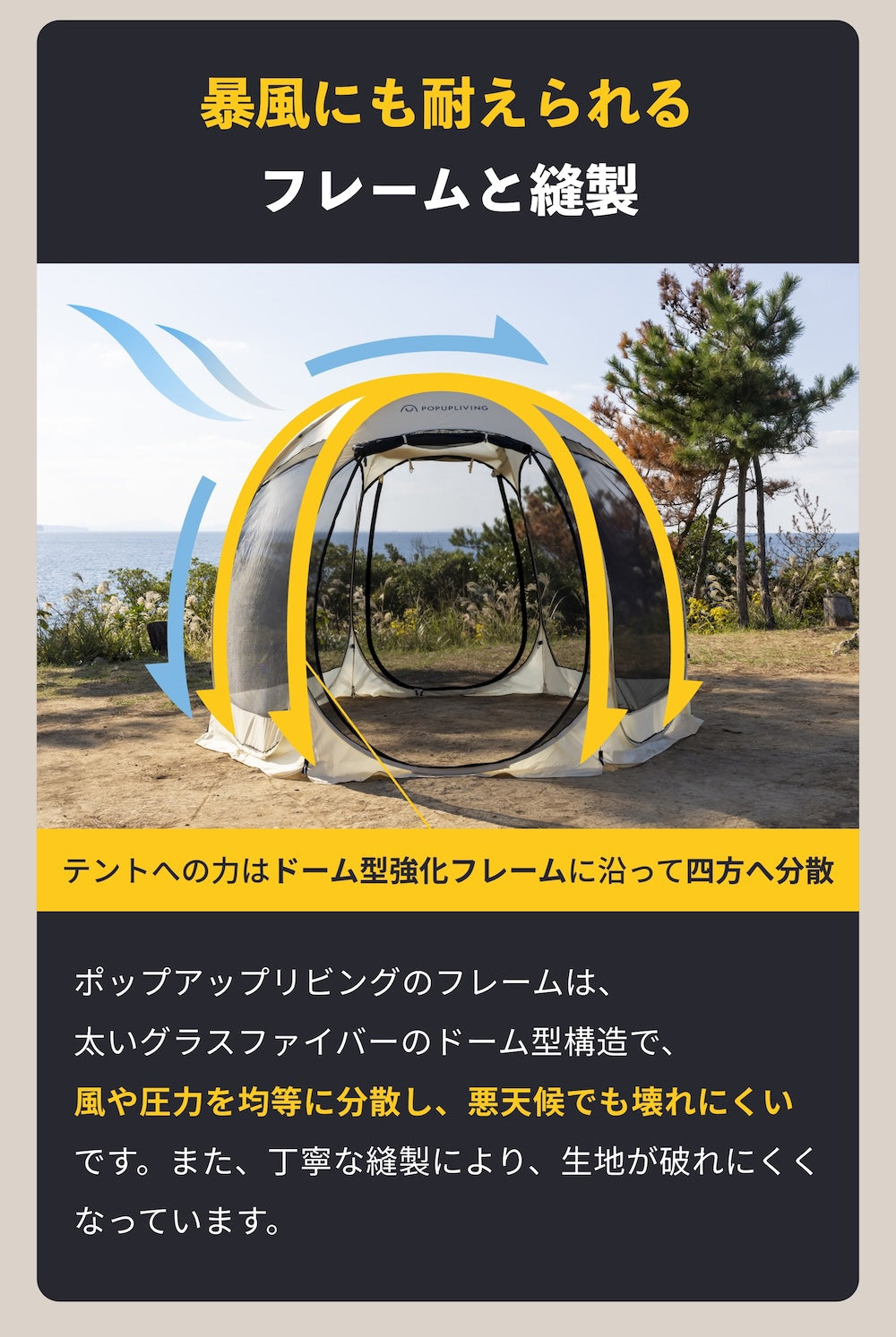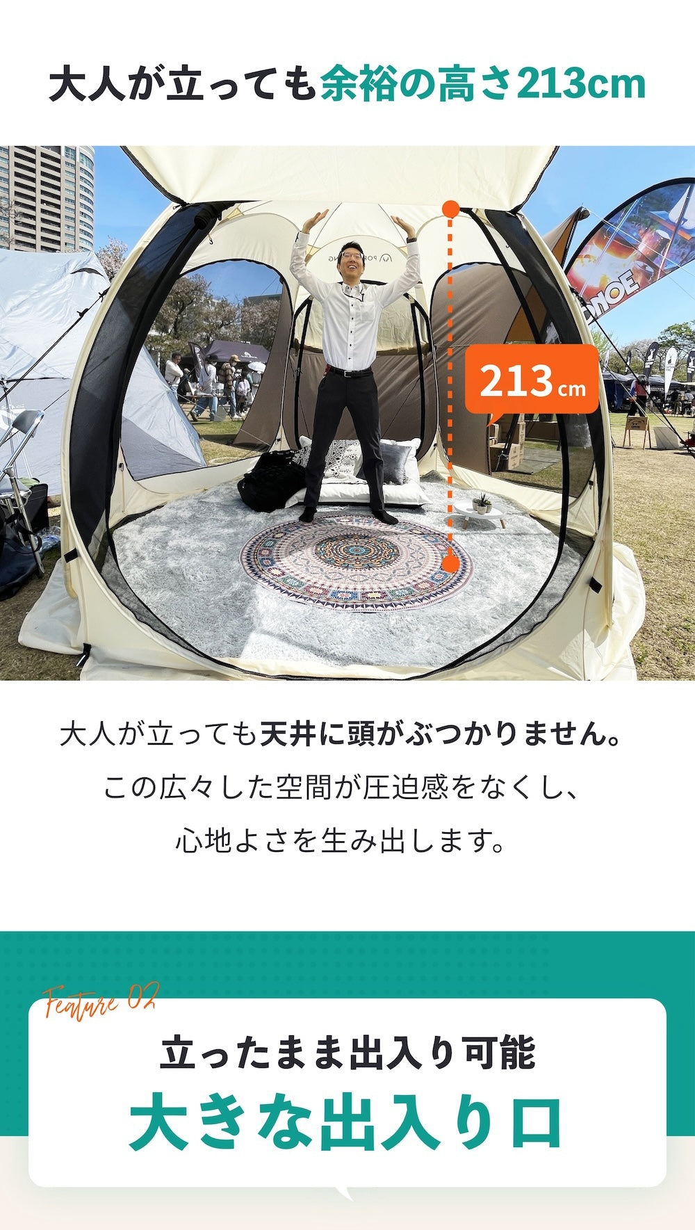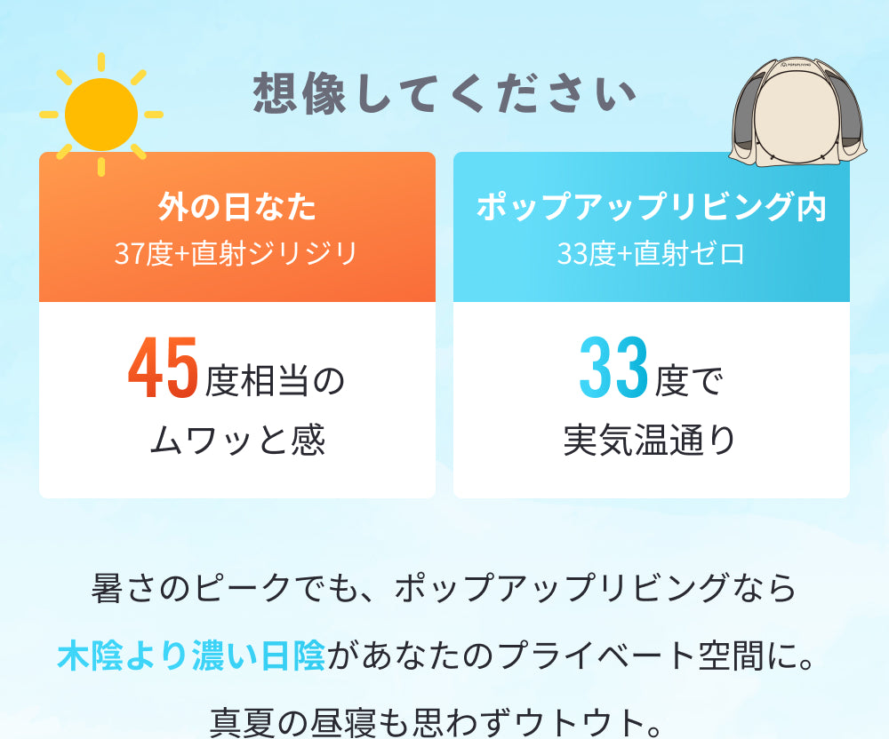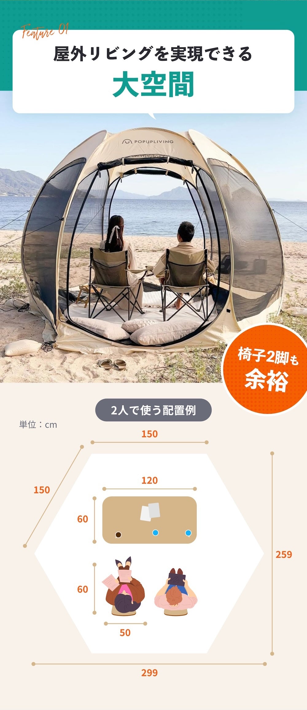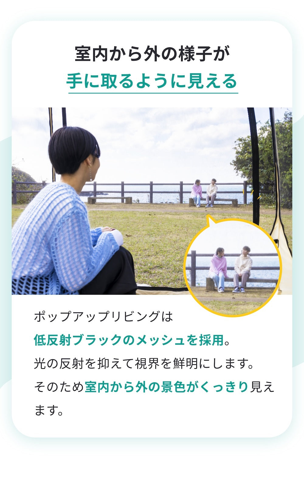多くのテントは風が通らず、太陽で内部がヒーターのように熱くなり真夏には使えませんが、ポップアップリビングは天井が高く、テント内の上空空間に集まった暑い空気をサイドの大きなメッシュ窓から排熱することができます。
