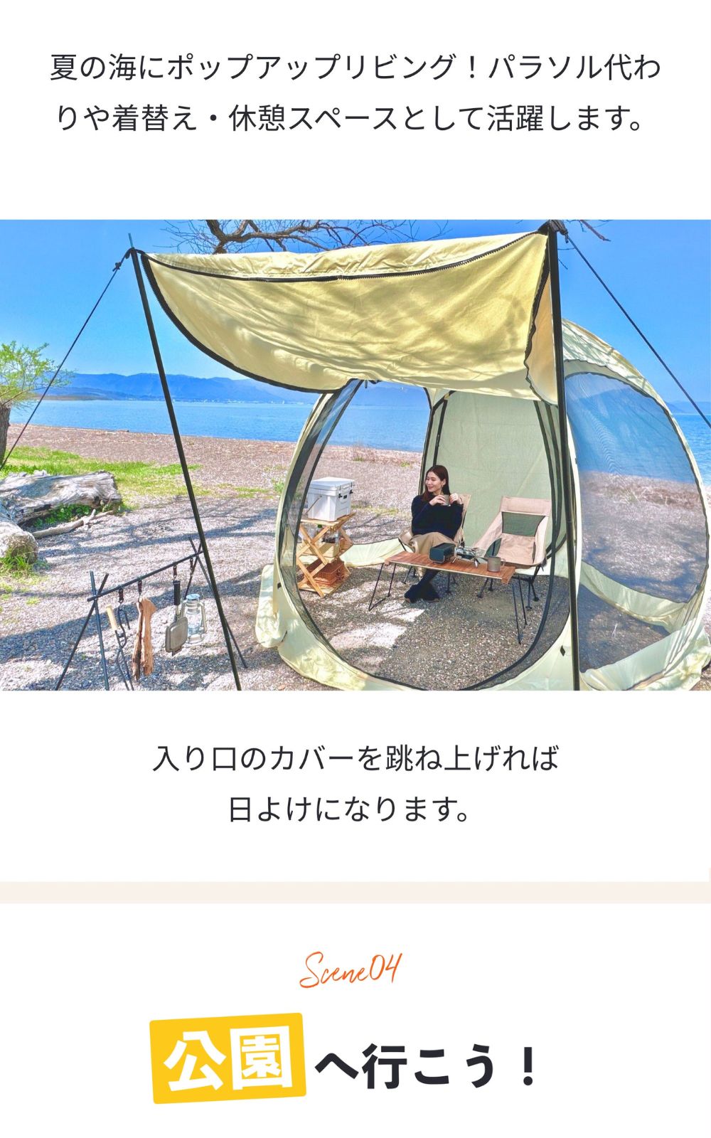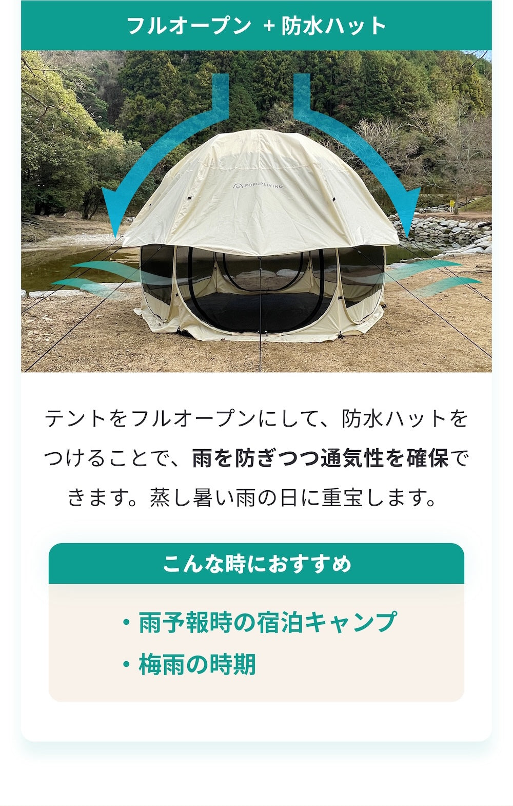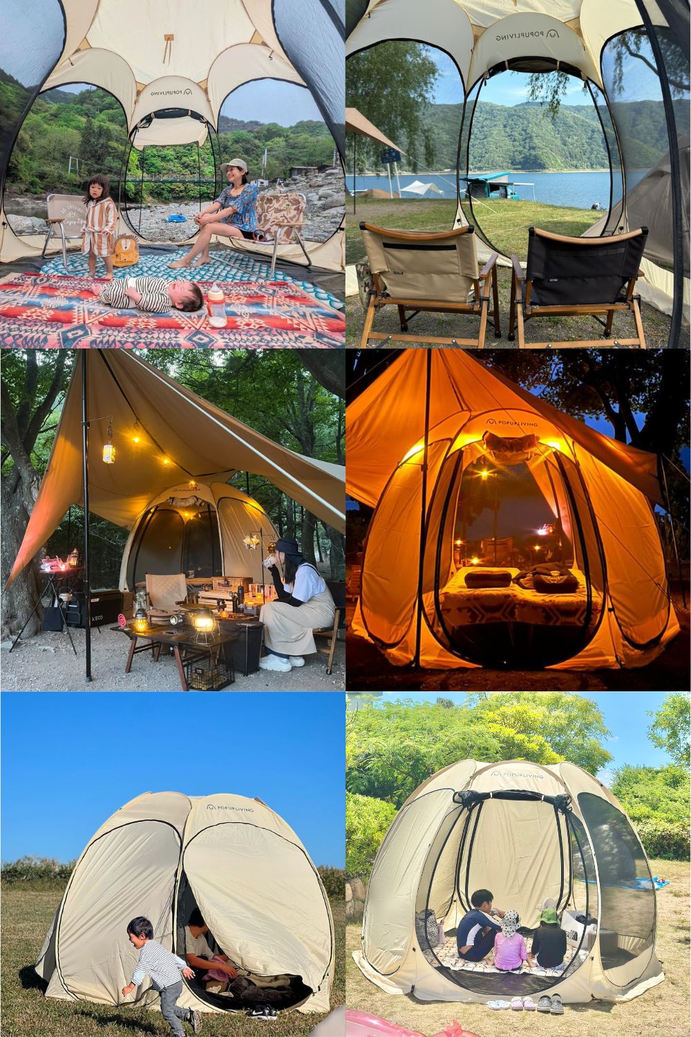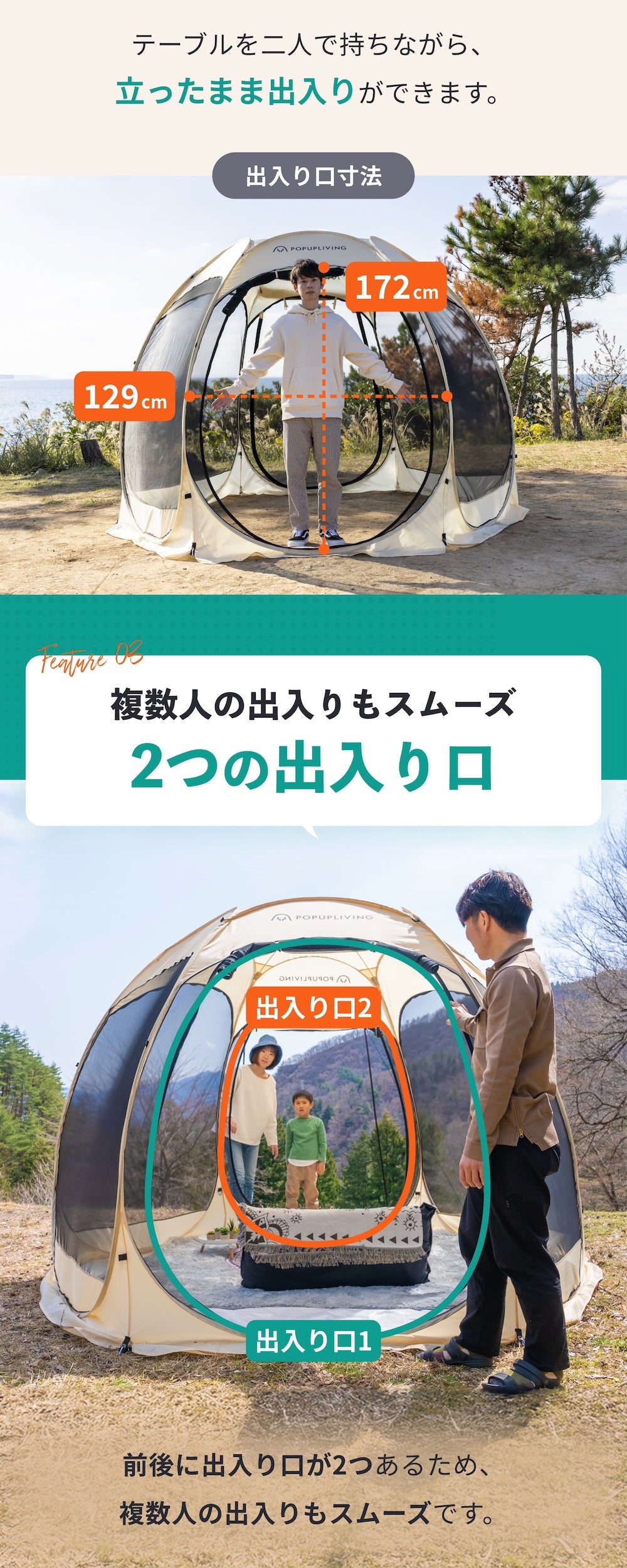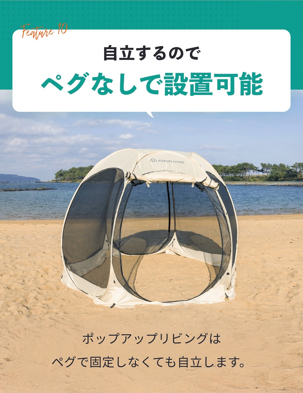多くのテントは風が通らず、太陽で内部がヒーターのように熱くなり真夏には使えませんが、ポップアップリビングは天井が高く、テント内の上空空間に集まった暑い空気をサイドの大きなメッシュ窓から排熱することができます。