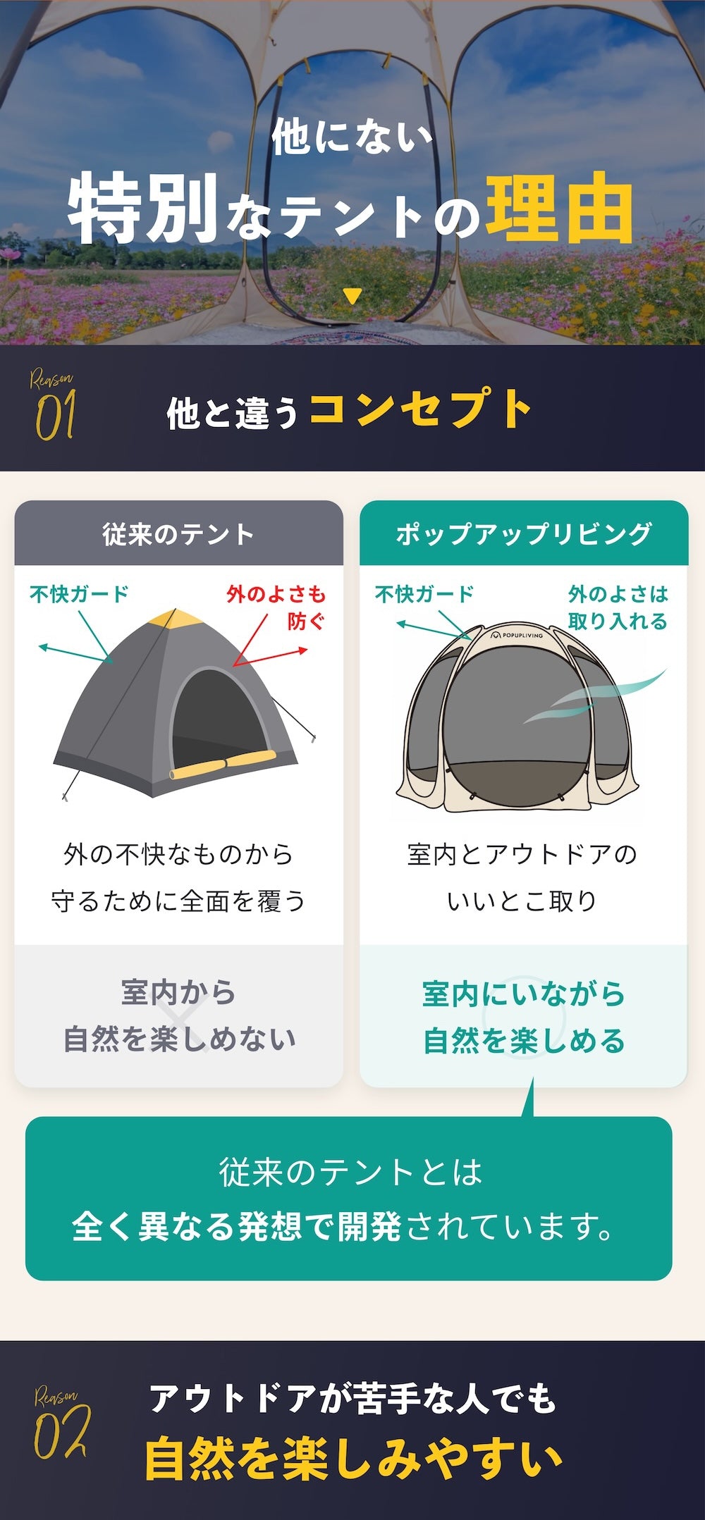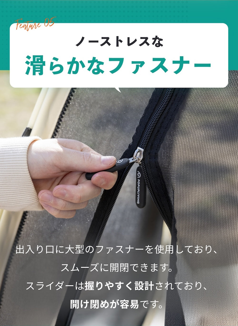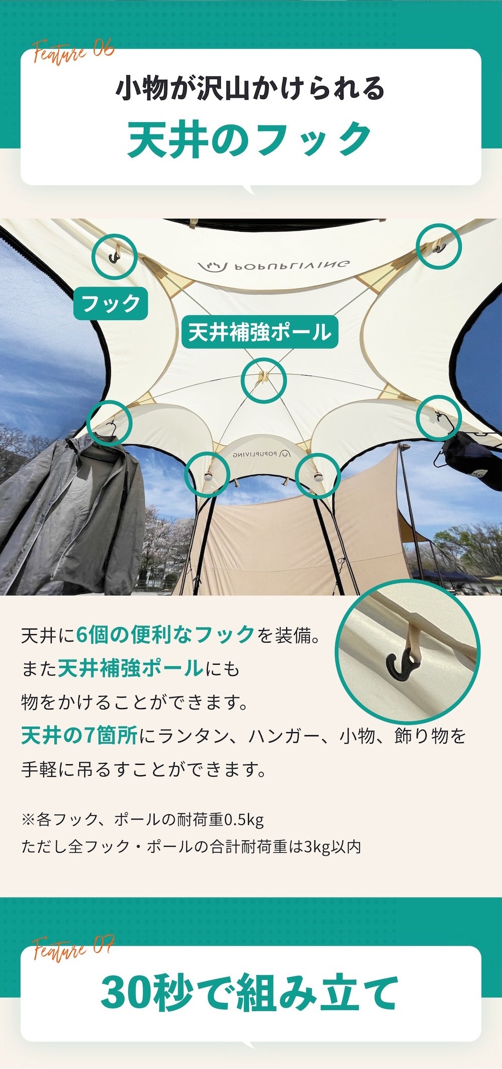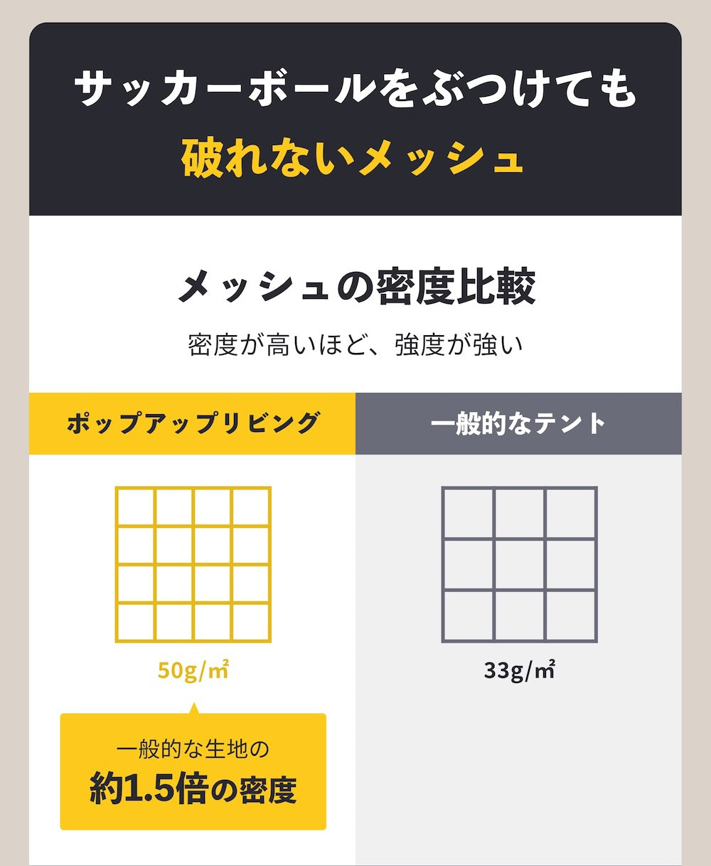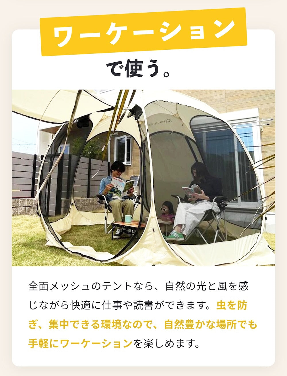 多くのテントは風が通らず、太陽で内部がヒーターのように熱くなり真夏には使えませんが、ポップアップリビングは天井が高く、テント内の上空空間に集まった暑い空気をサイドの大きなメッシュ窓から排熱することができます。