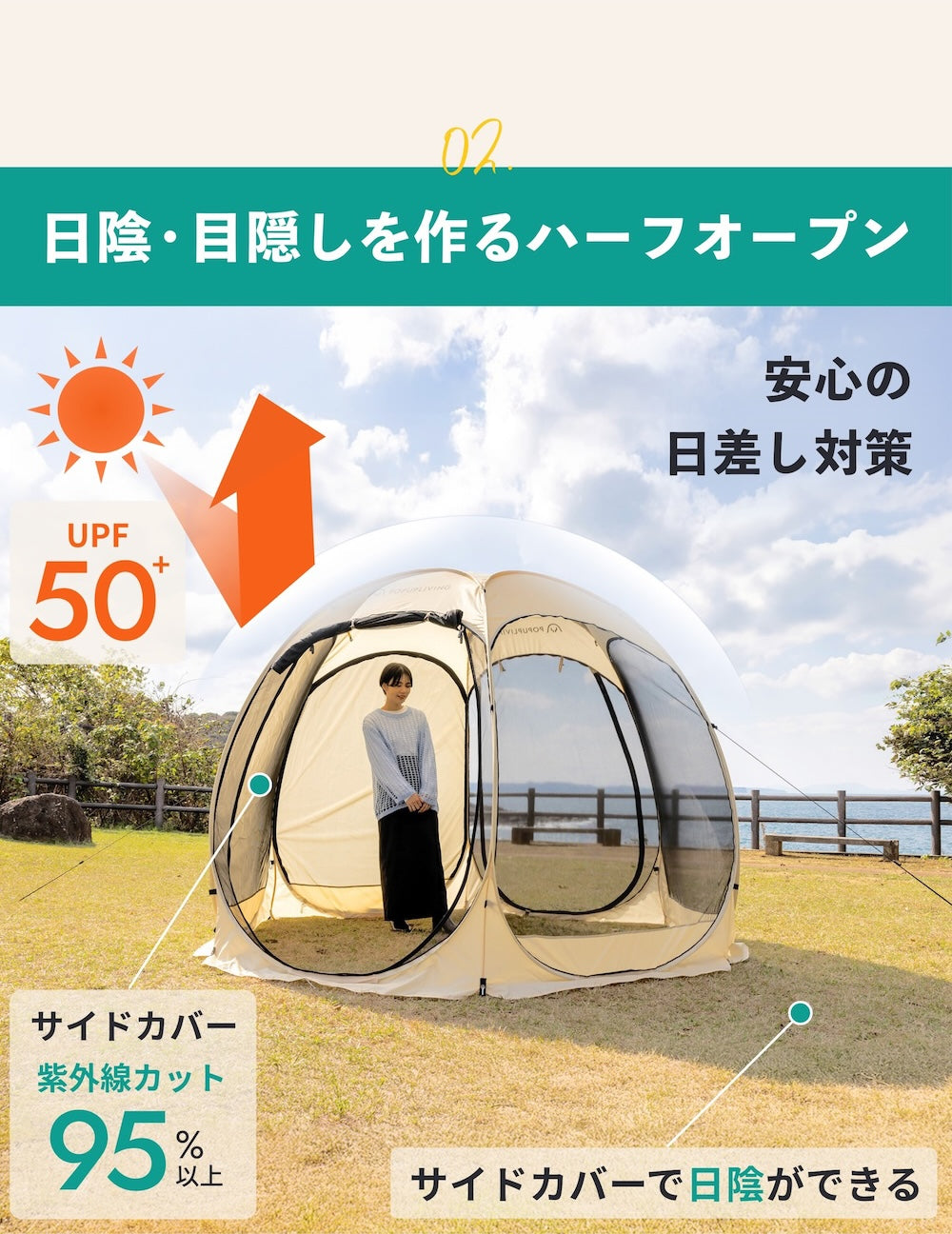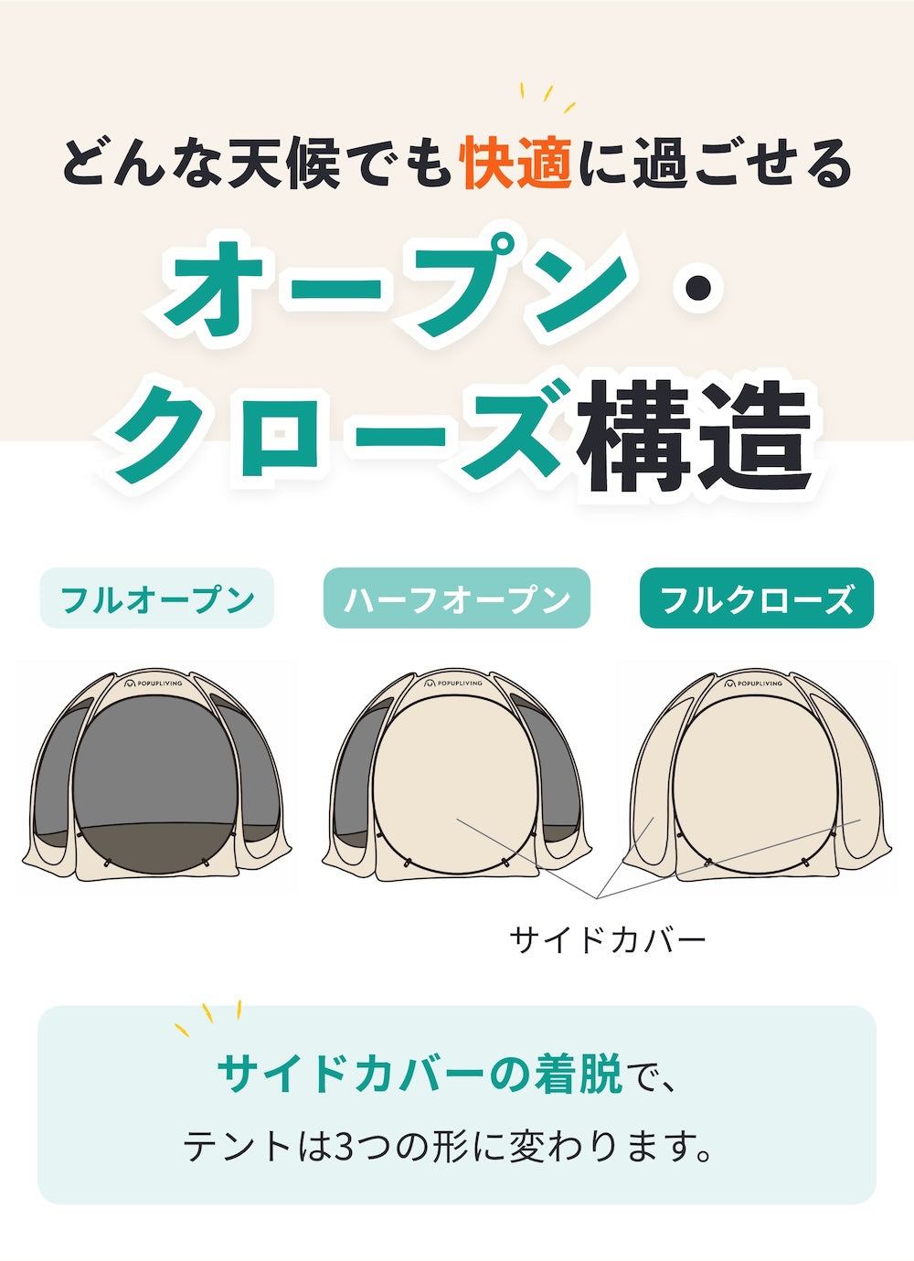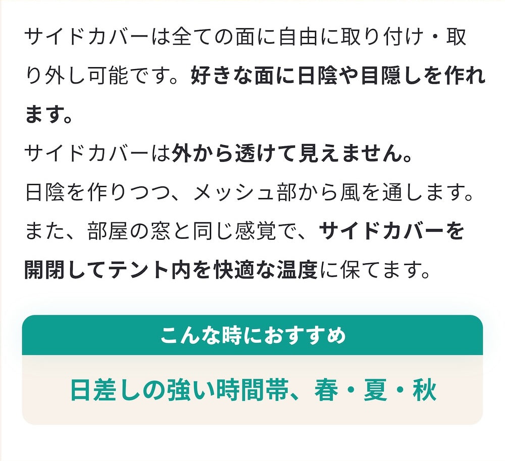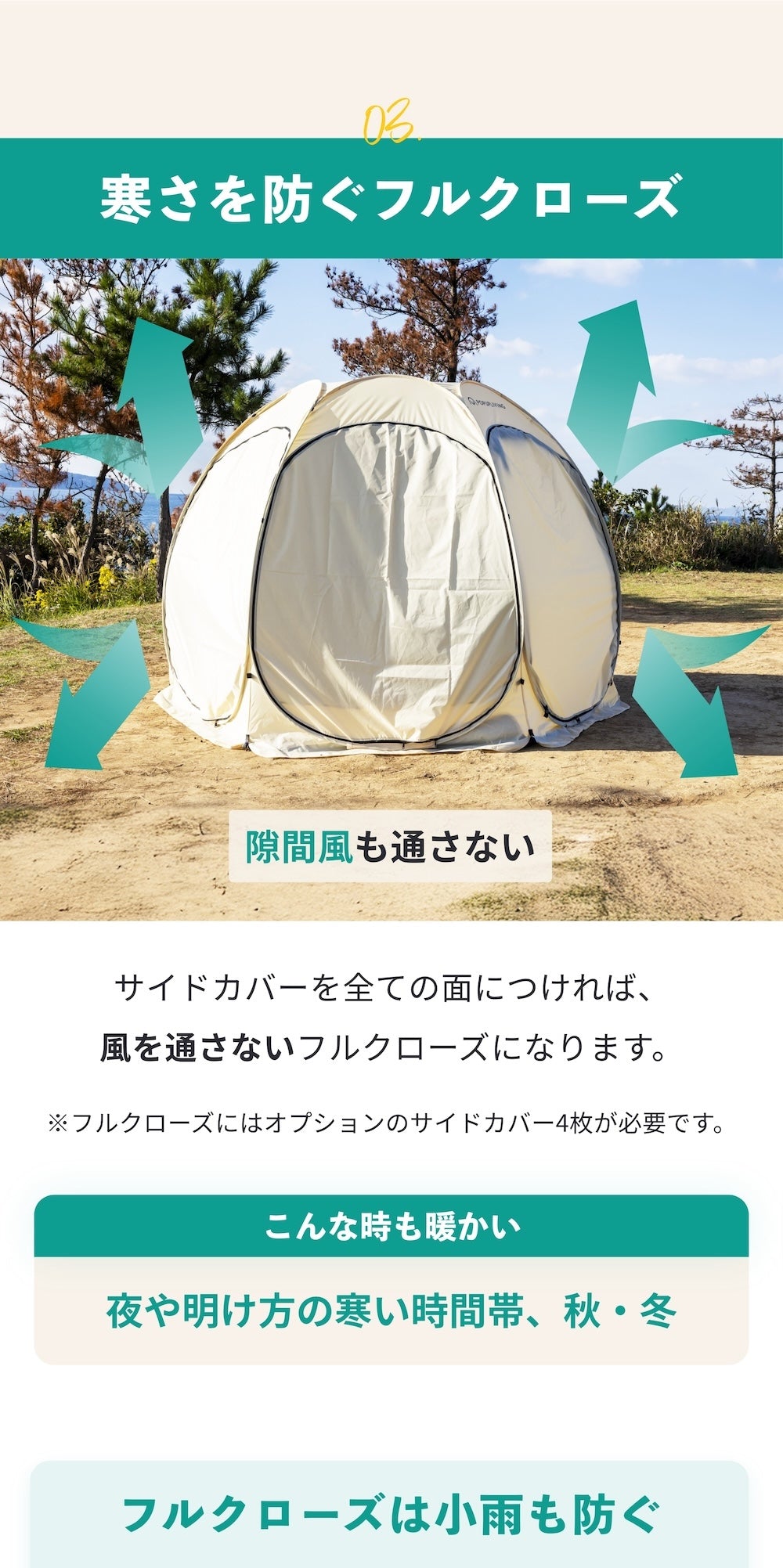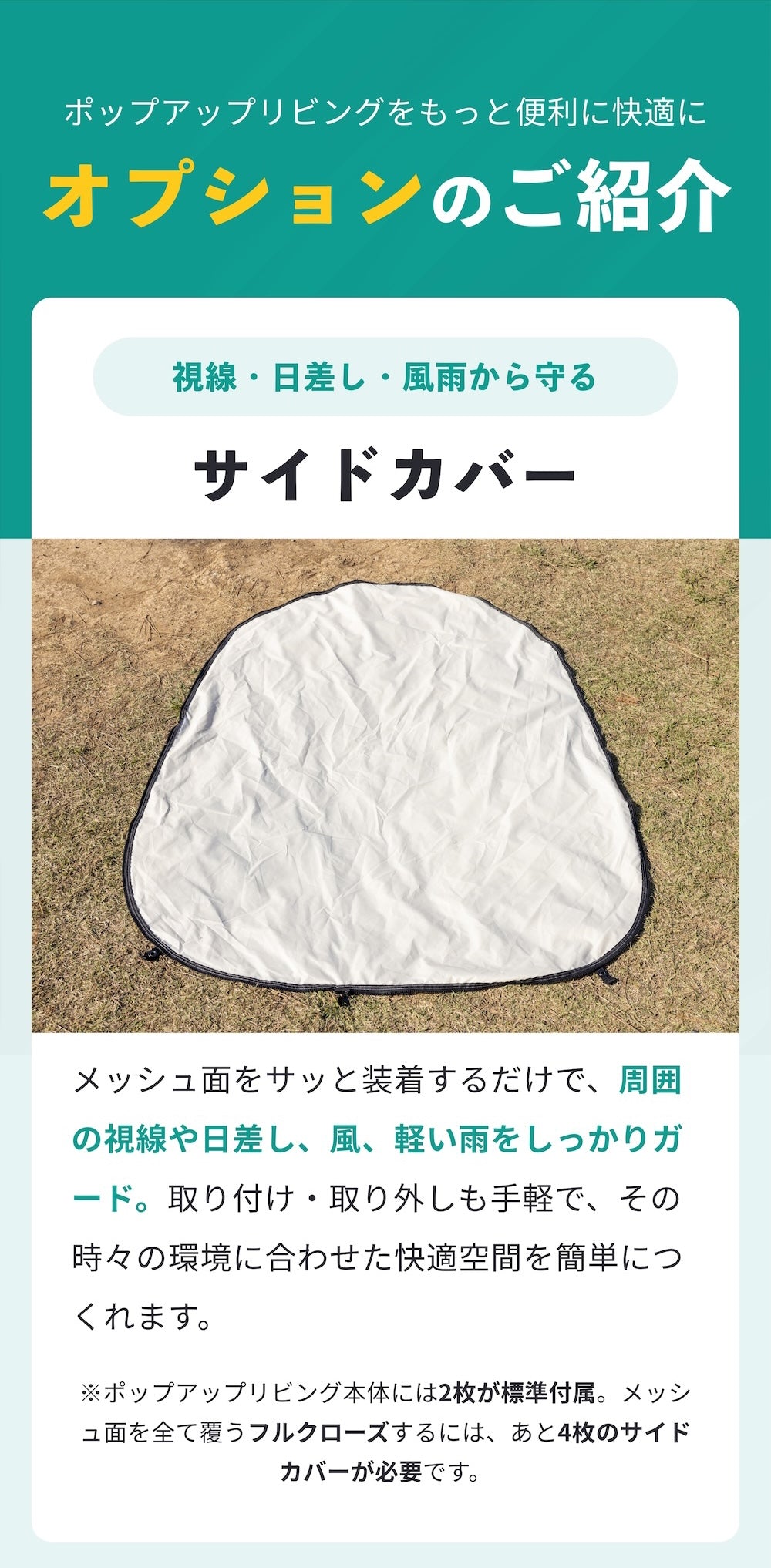 オプションのサイドカバーをつければ、外からテント内を見ることができず、プライバシーを確保できます。(その場合、フルセットが10%OFFでお得です)