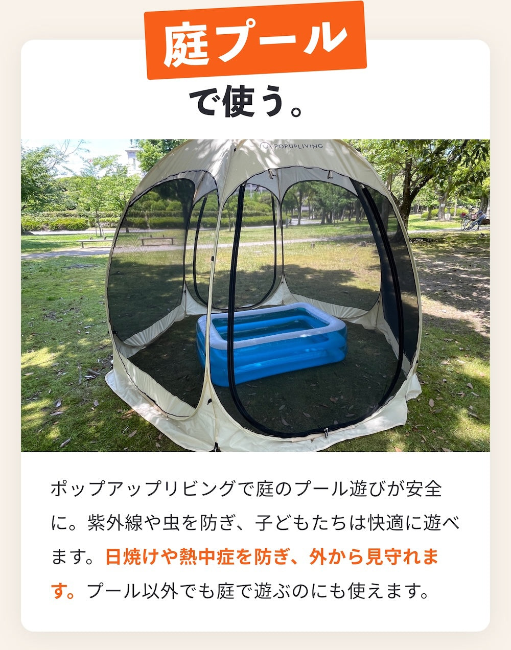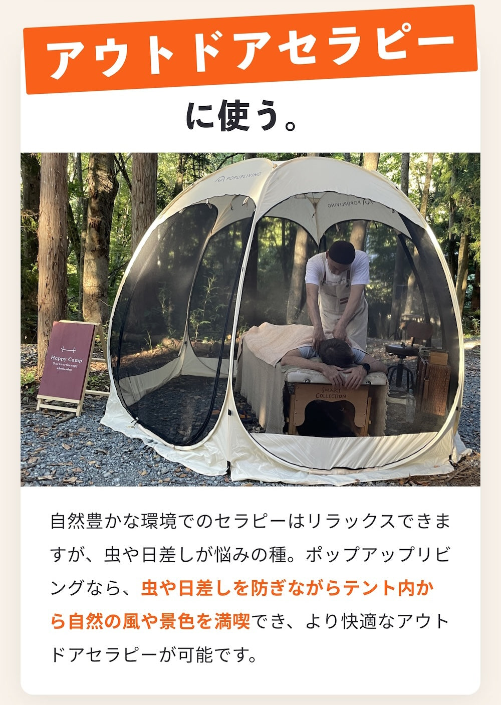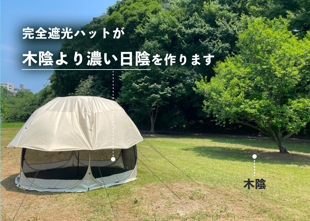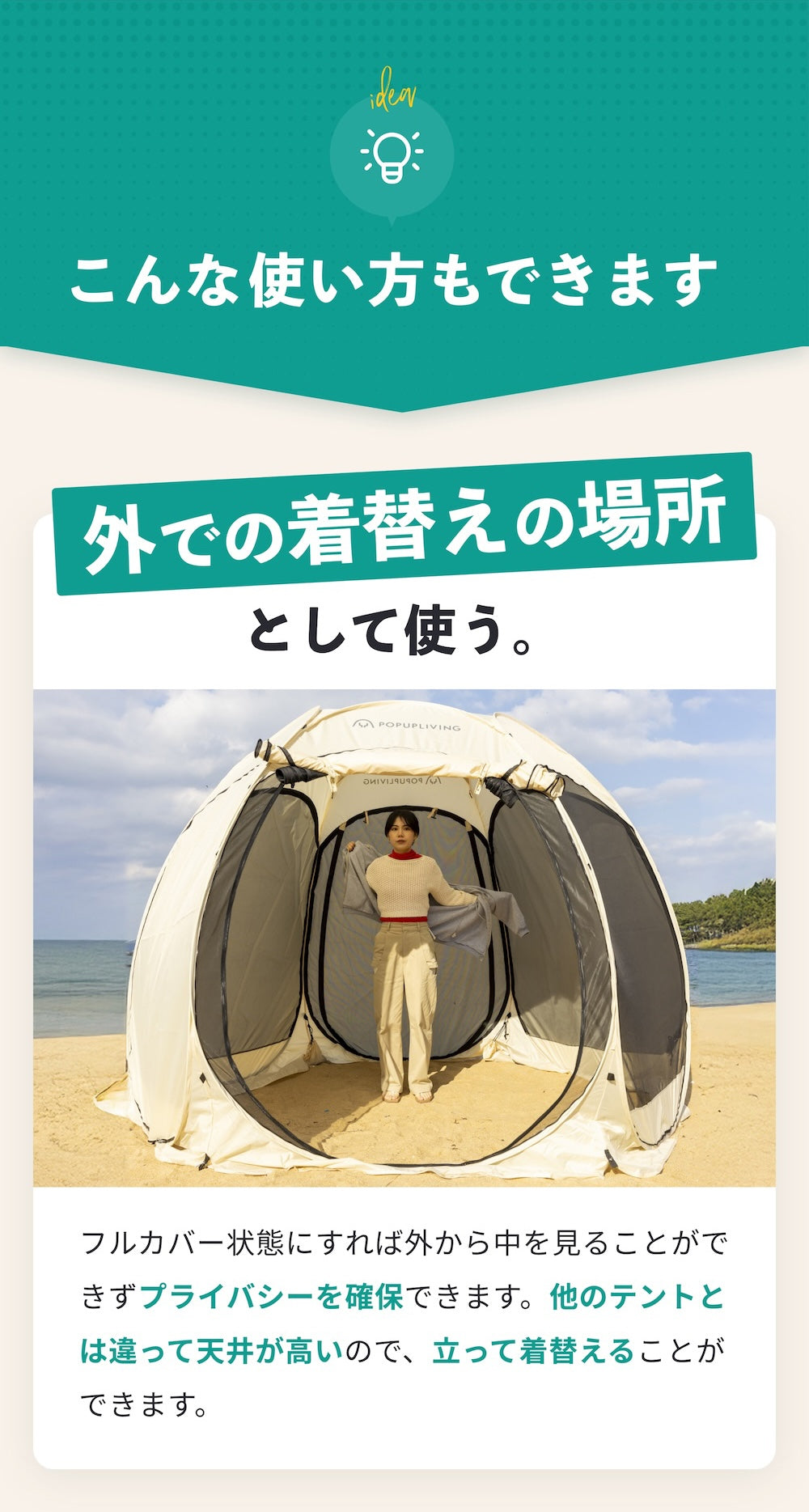 オプションのサイドカバーをつければ、外からテント内を見ることができず、プライバシーを確保できます。(その場合、フルセットが10%OFFでお得です)