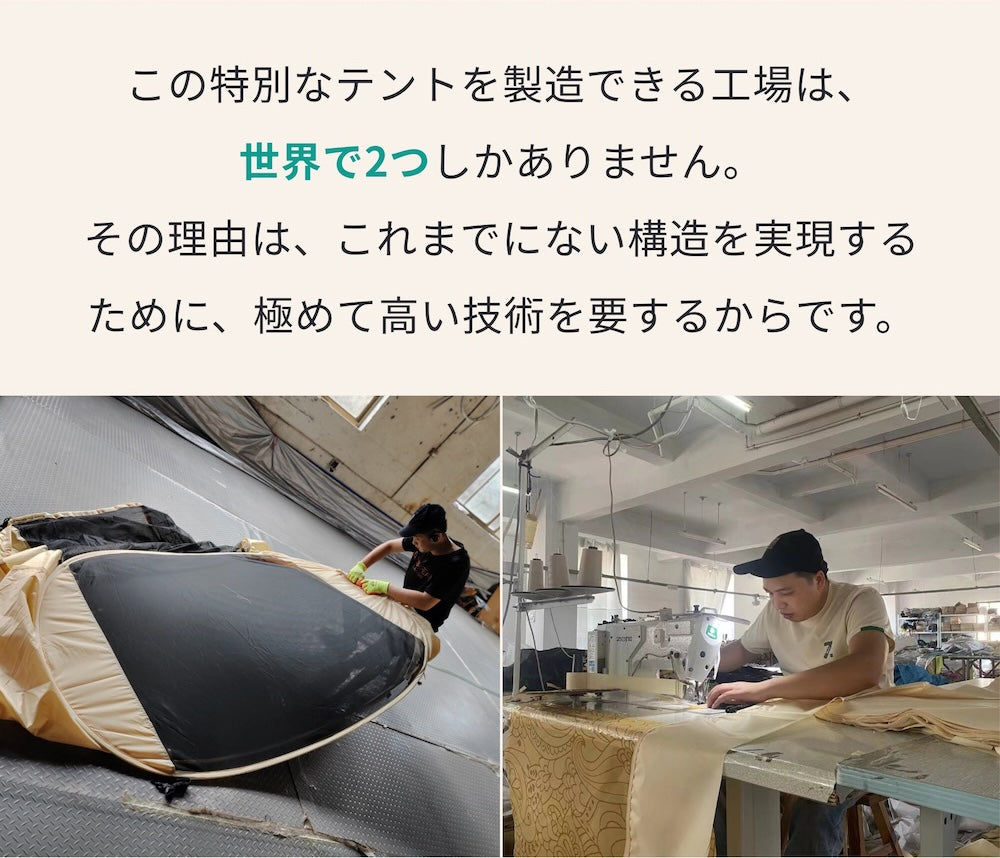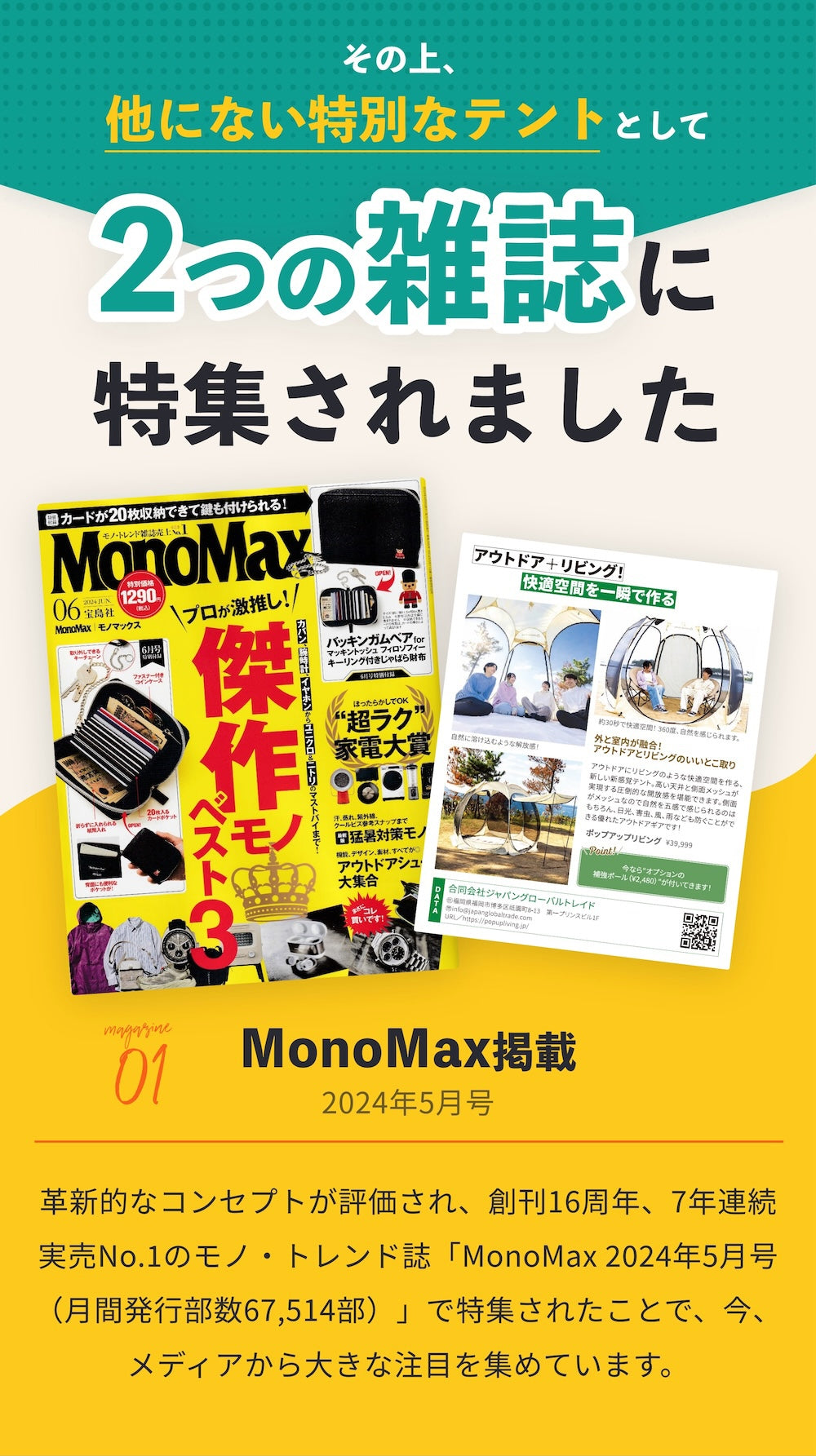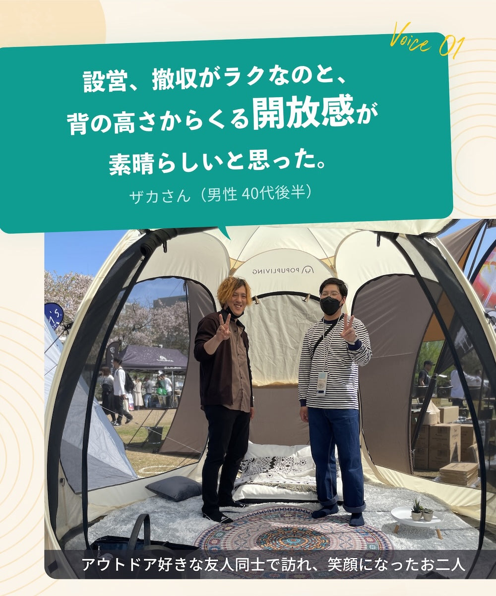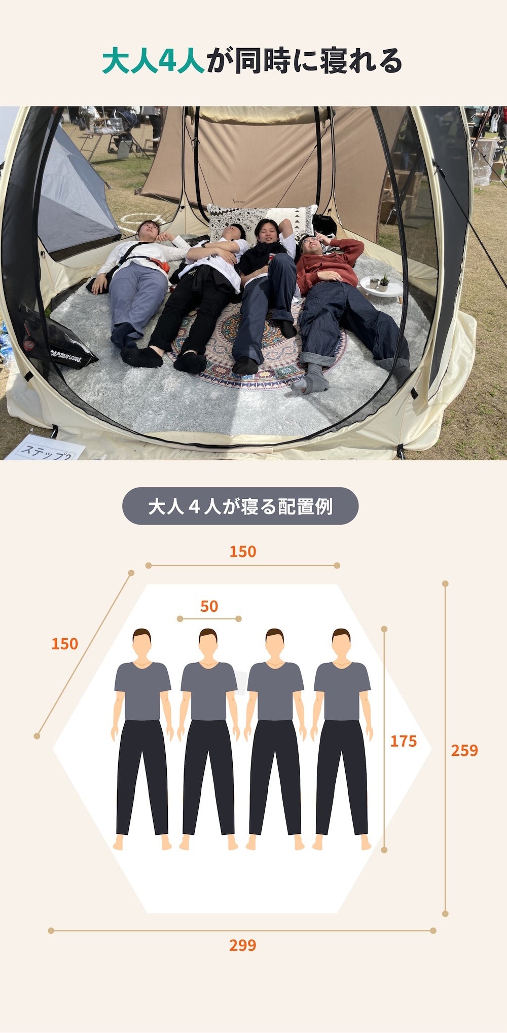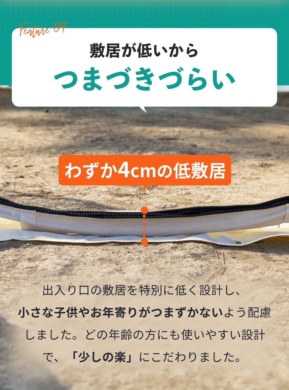 オプションのサイドカバーをつければ、外からテント内を見ることができず、プライバシーを確保できます。(その場合、フルセットが10%OFFでお得です)