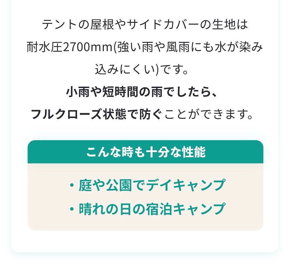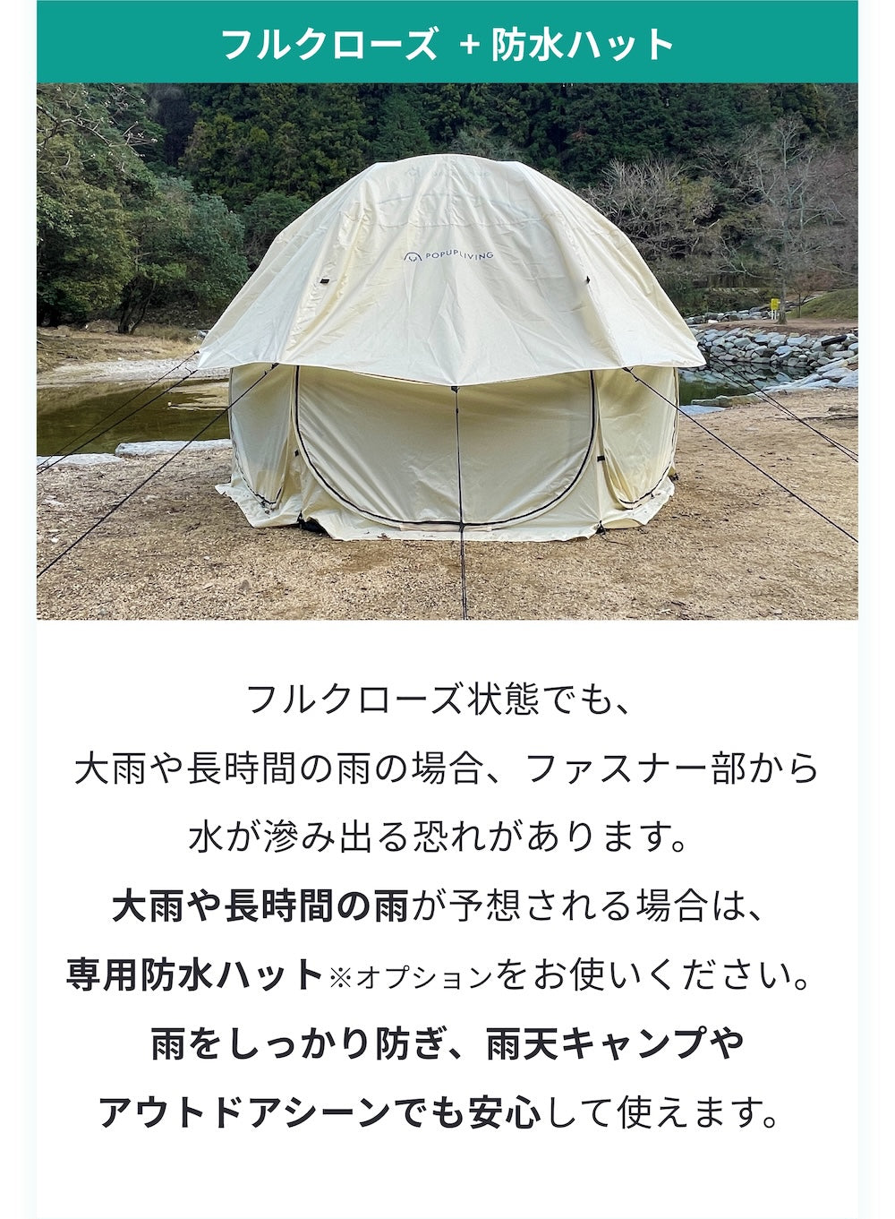 大雨や長時間の雨の場合:「フルセット+防水」オプションで対応できます。「フルセット+防水」オプションはそれぞれ単体で購入するより15%お得です。