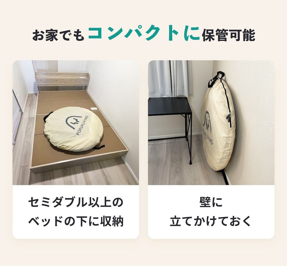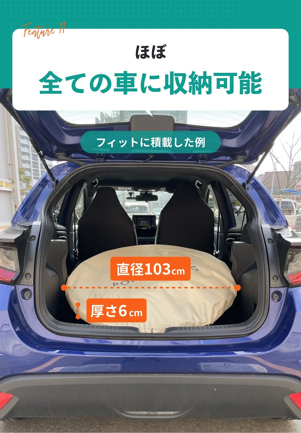 収納する際は、直径103cm、厚さ6cmの円盤形になります。この大きさのスペースがあればどこでも収納でき、一般的なコンパクトカーのトランクにも入ります。また、平たい形状のため、押し入れの隙間などにも簡単に収めることができます。