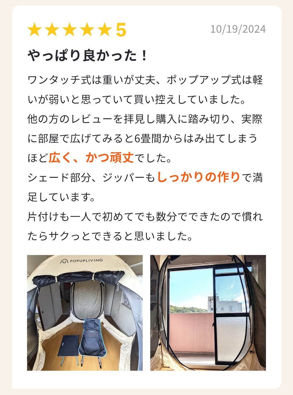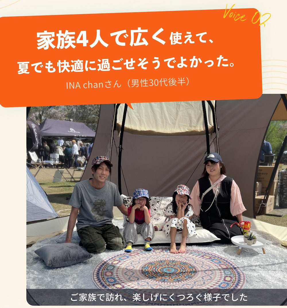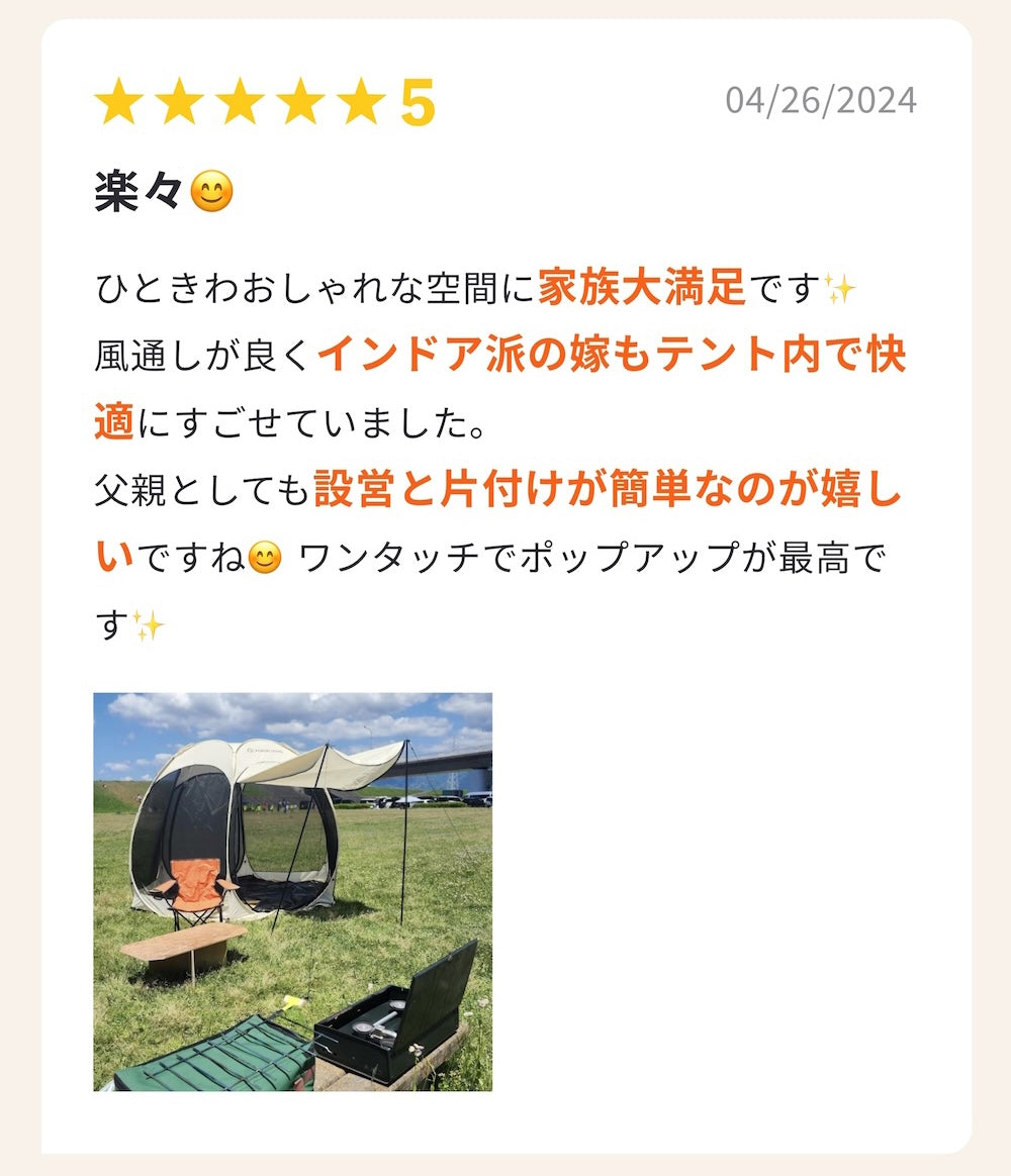 そのため、他のテントと比べて涼しく感じることができ、真夏でも快適に過ごしやすいです。