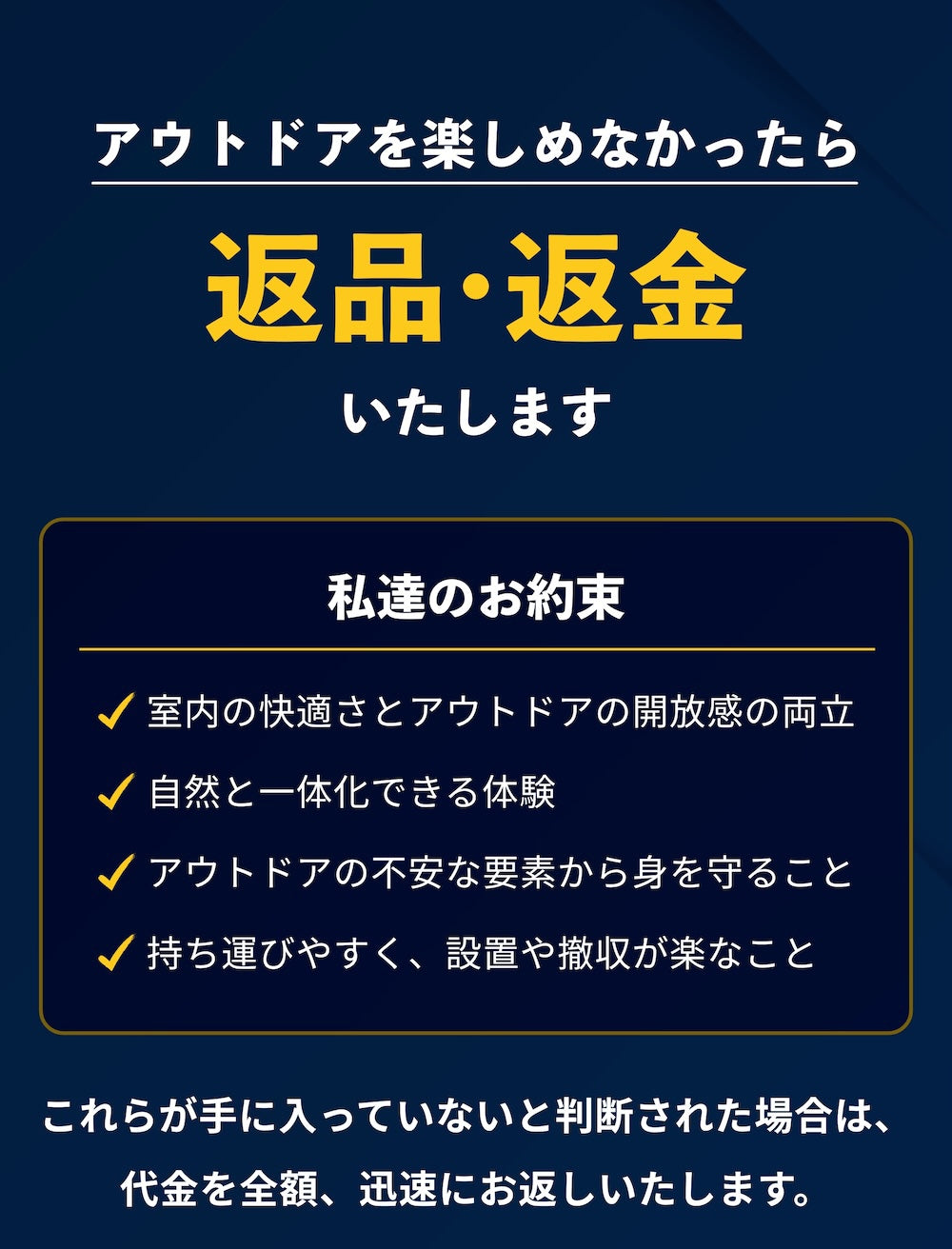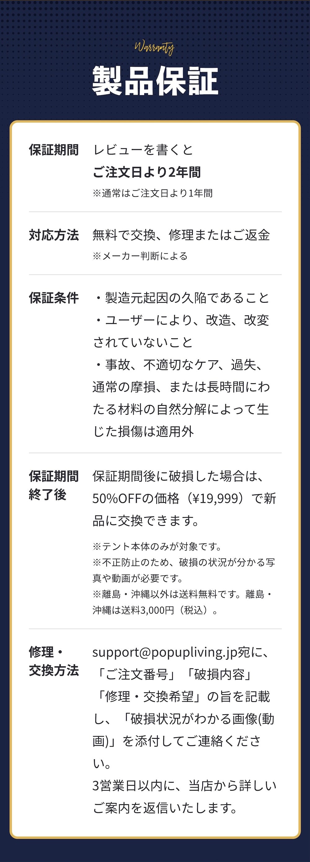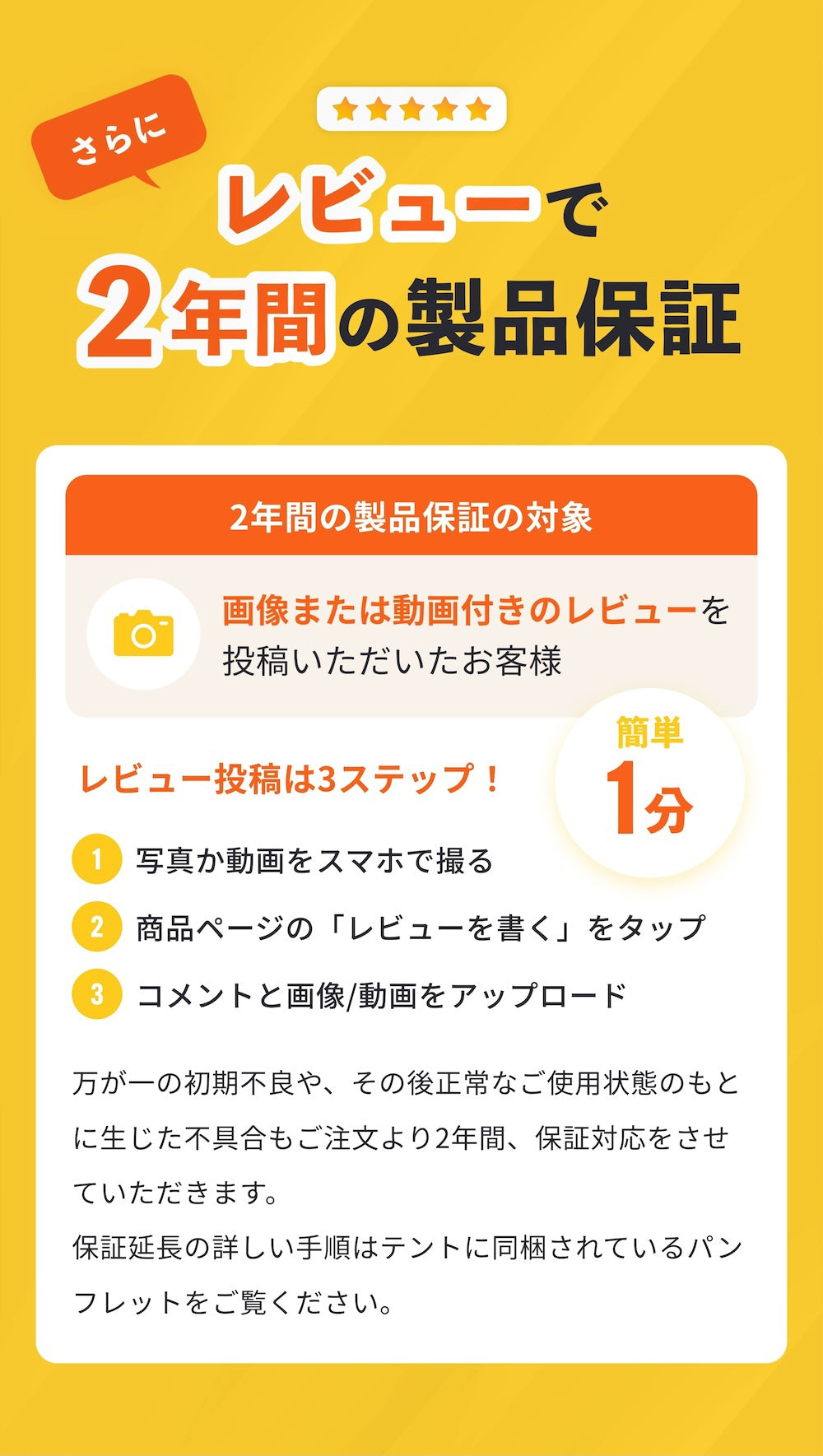 通常は1年保証ですが、画像または動画付きのレビューを投稿いただいたい場合は2年保証にさせていただきます。詳しい手順はテントに同梱されているパンフレットをご覧ください。