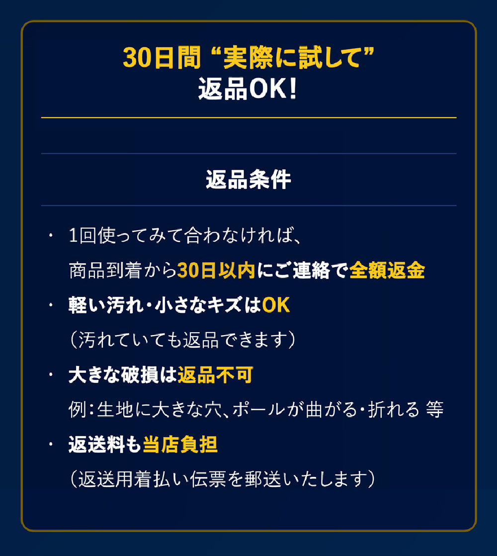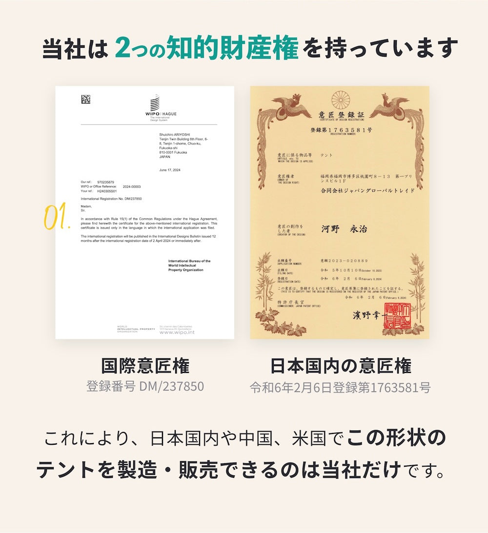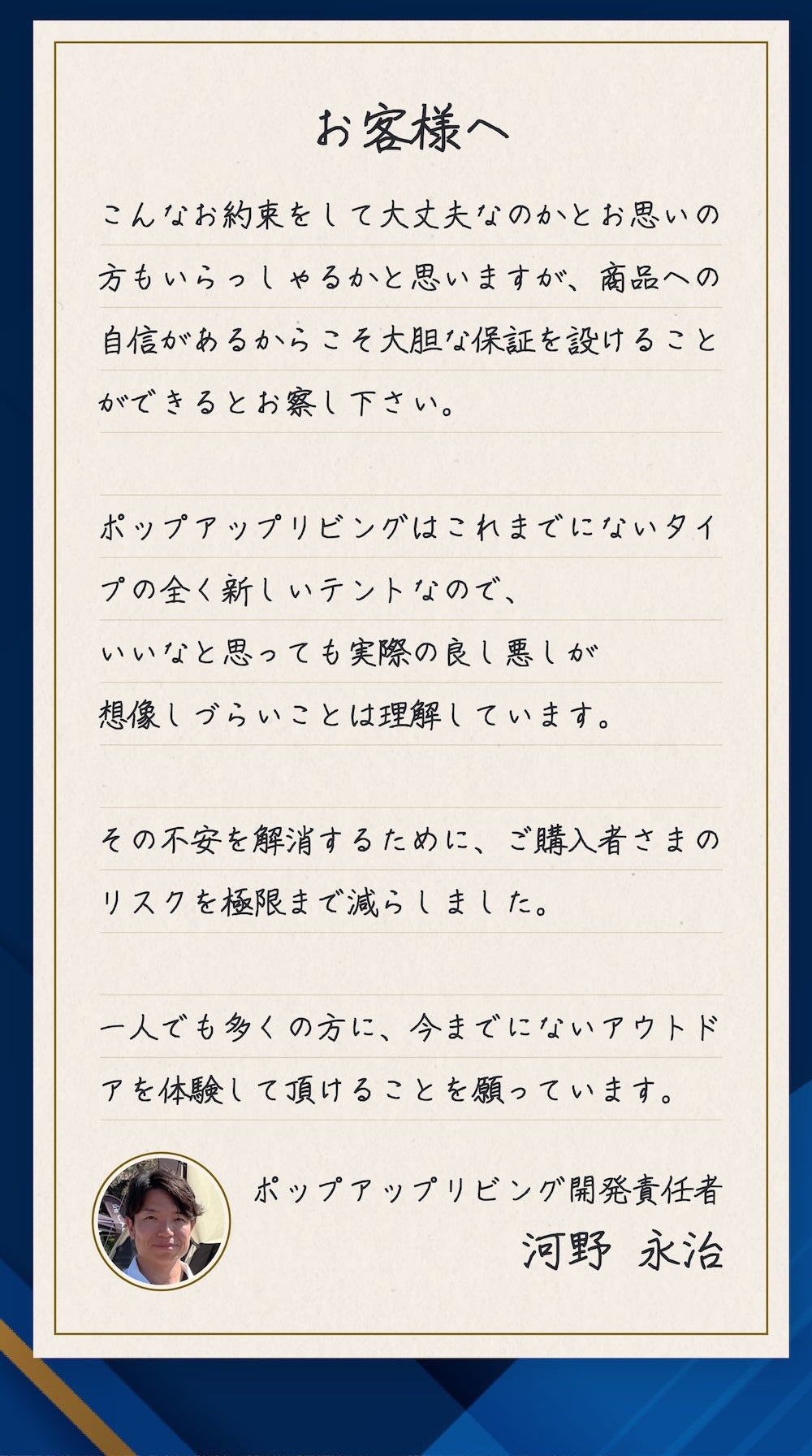 通常は1年保証ですが、画像または動画付きのレビューを投稿いただいたい場合は2年保証にさせていただきます。詳しい手順はテントに同梱されているパンフレットをご覧ください。