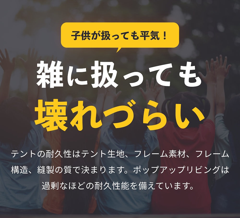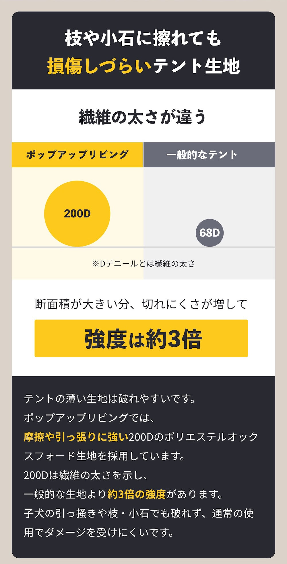 安価なテントとは全く違う、引き裂き強度と耐久性があるオックスフォード生地や強くしなやかなポールを使っていますので、ご安心してお使いください。