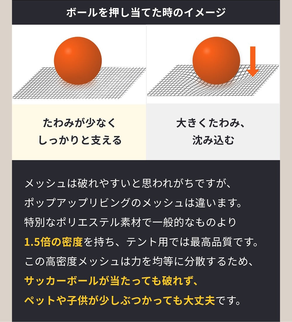 メッシュ部は破れに強い丈夫な材質で作られており、簡単には破れたり穴が空いたりしませんので、ご安心ください。