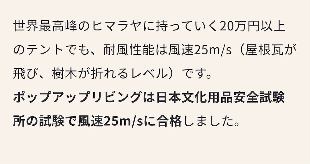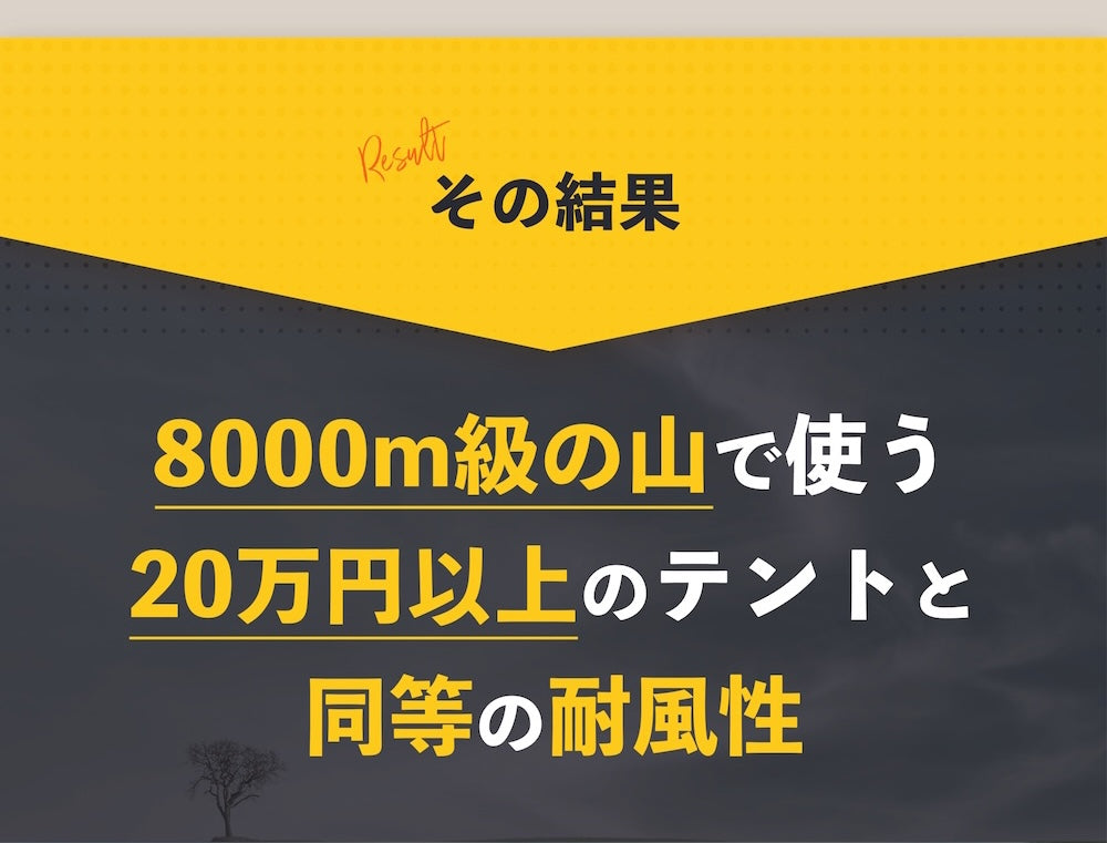 - テントが破損する前にペグが抜ける可能性が高いため、強風時は30cm以上のペグ使用をおすすめします。