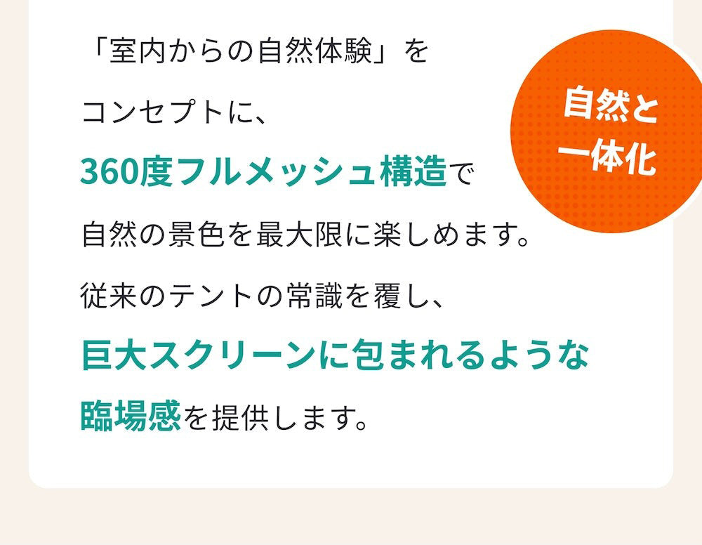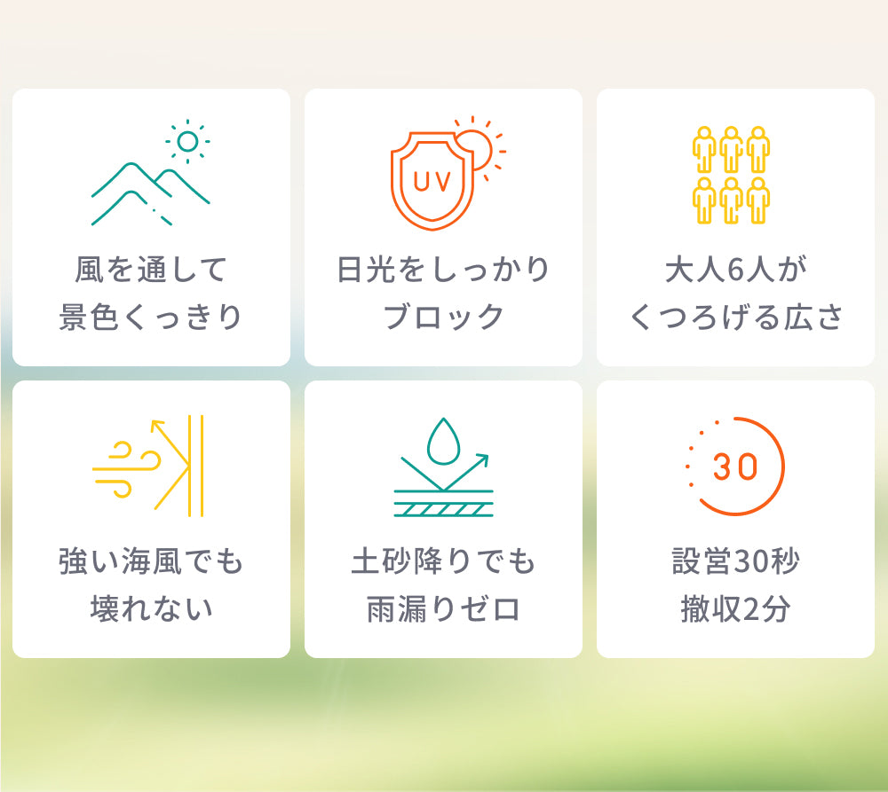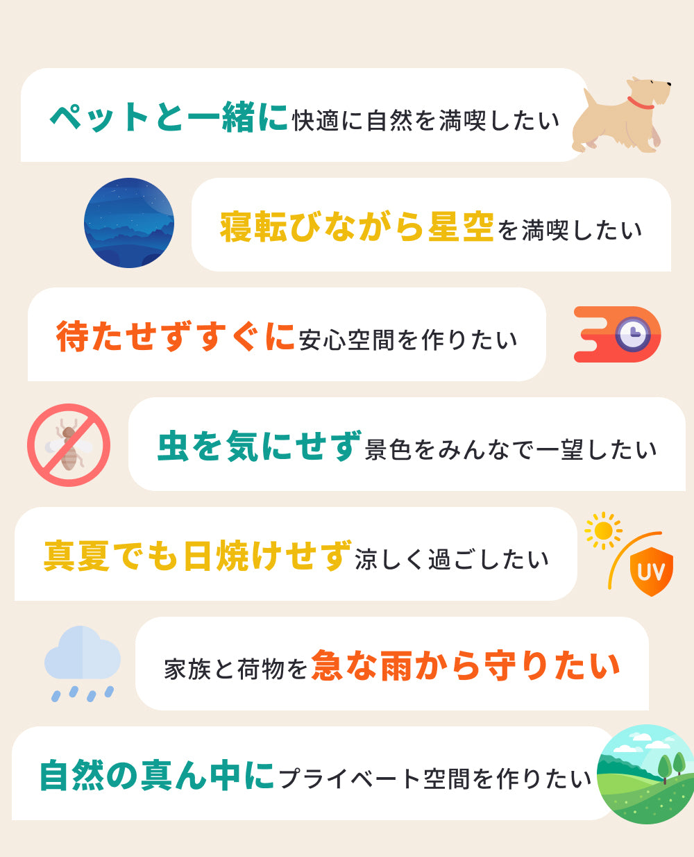 風や視線を防ぎ、宿泊することが可能です。雨が予想される宿泊の際は、「フルセット+防水」オプションをお勧めいたします。夜中に雨が降っても安心です。