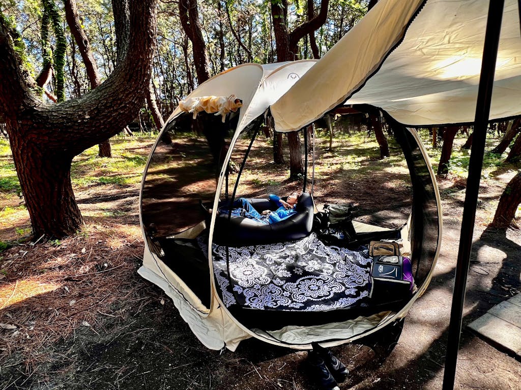 広げた瞬間に、「こんなに開放感があるの!?」と驚くほどの広々とした空間が広がります。天井が高く、黒いメッシュ越しに外の景色がよく見えるので、圧迫感もありません。しかも、メッシュの目が細かいため 虫の侵入を防ぎながら、しっかり風を通してくれる のがとても便利です。