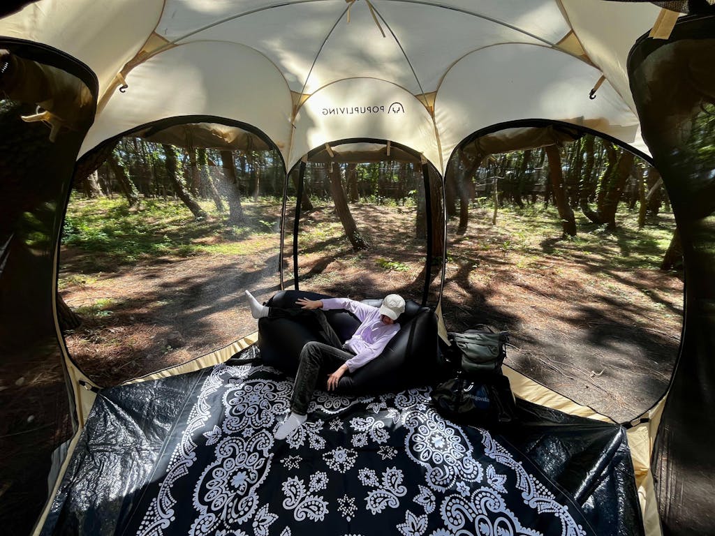 デイキャンプやピクニックはもちろん、自宅の庭でも手軽に特別な空間を作れる POPUPLIVINGのポップアップテント。
