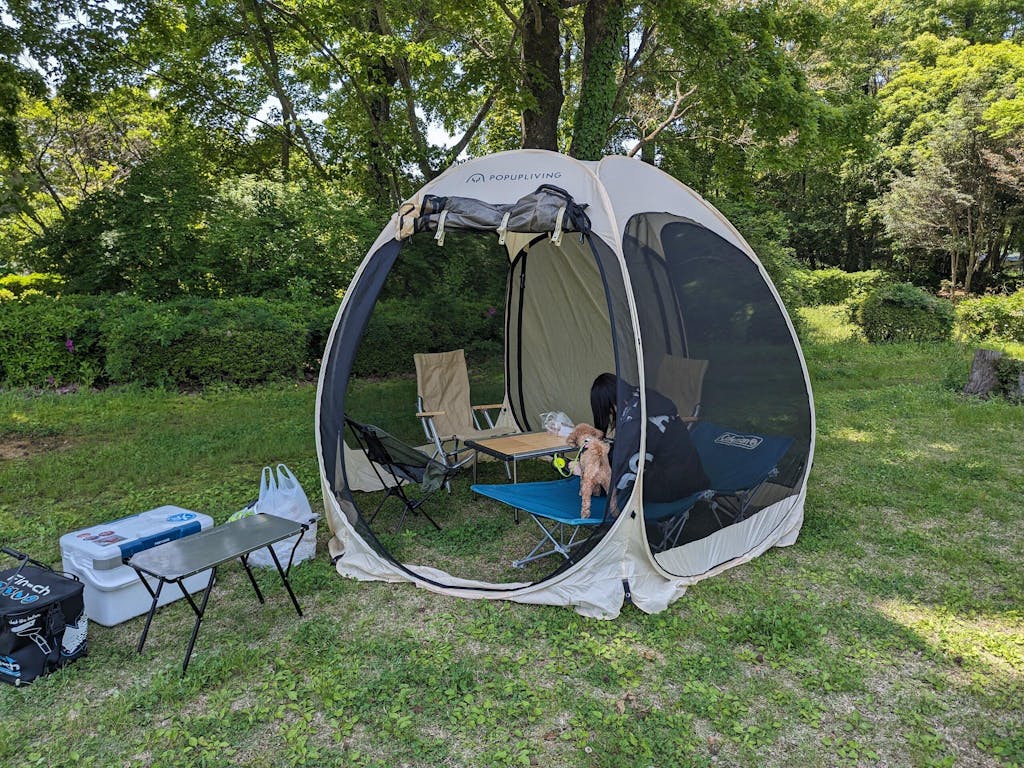 2歳児とキャンプへ行くのに、簡単に設営できるスクリーンテントのようなものを探していたところ、ポップアップリビングに出会いました。